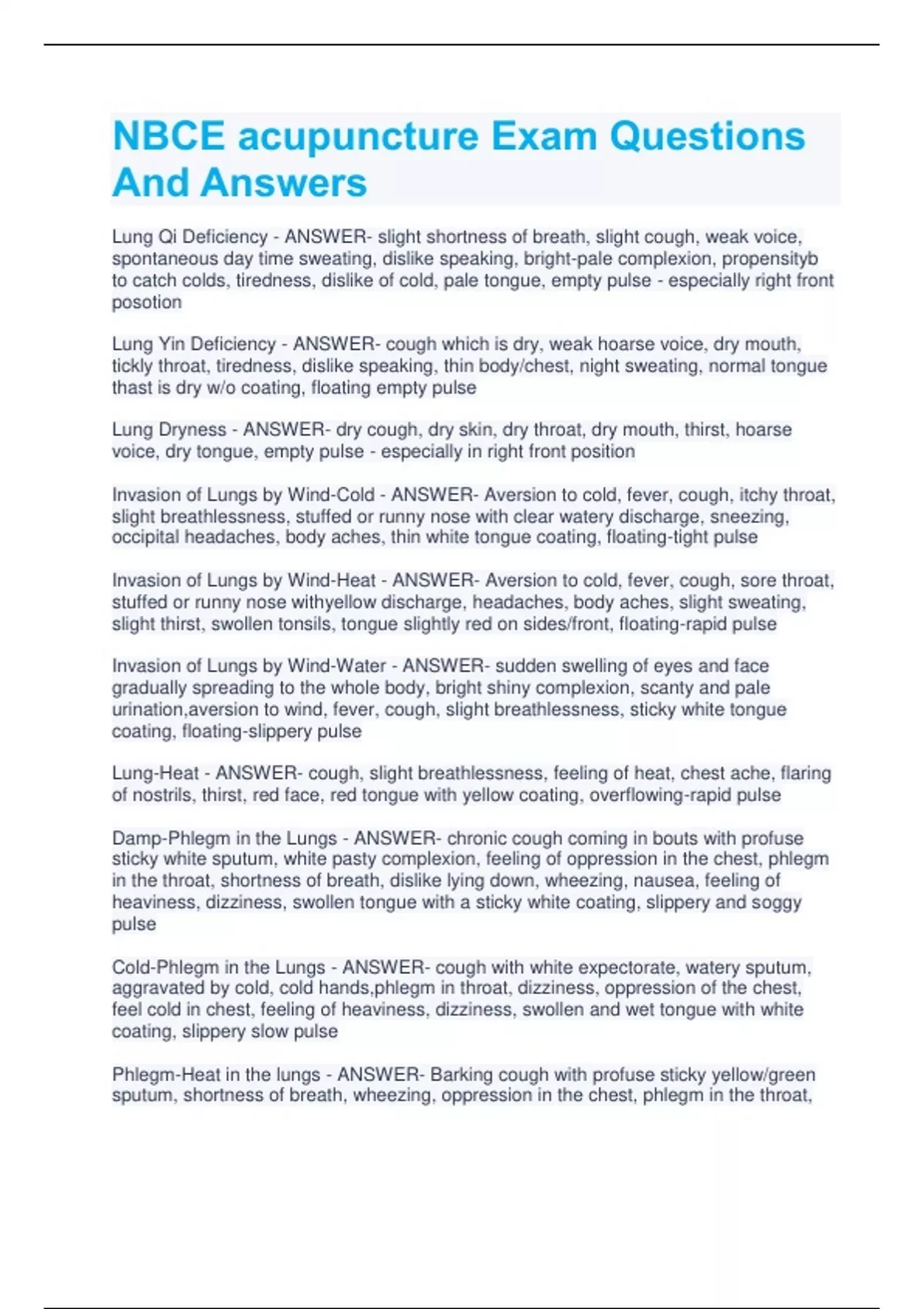NBCE acupuncture Exam Questions And Answers Lung Qi Deficiency - ANSWER- slight shortness of breath, slight cough, weak voice, spontaneous day time sweating, dislike speaking, bright-pale complexion, propensityb to catch colds, tiredness, dislike of cold, pale tongue, empty pulse - especially right front posotion Lung Yin Deficiency - ANSWER- cough which is dry, weak hoarse voice, dry mouth, tickly throat, tiredness, dislike speaking, thin body/chest, night sweating, normal tongue thast is dry w/o coating, floating empty pulse Lung Dryness - ANSWER- dry cough, dry skin, dry throat, dry mouth, thirst, hoarse voice, dry tongue, empty pulse - especially in right front position Invasion of Lungs by Wind-Cold - ANSWER- Aversion to cold, fever, cough, itchy throat, slight breathlessness, stuffed or runny nose with clear watery discharge, sneezing, occipital headaches, body aches, thin white tongue coating, floating-tight pulse Invasion of Lungs by Wind-Heat - ANSWER- Aversion to cold, fever, cough, sore throat, stuffed or runny nose withyellow discharge, headaches, body aches, slight sweating, slight thirst, swollen tonsils, tongue slightly red on sides/front, floating-rapid pulse Invasion of Lungs by Wind-Water - ANSWER- sudden swelling of eyes and face gradually spreading to the whole body, bright shiny complexion, scanty and pale urination,aversion to wind, fever, cough, slight breathlessness, sticky white tongue coating, floating-slippery pulse Lung-Heat - ANSWER- cough, slight breathlessness, feeling of heat, chest ache, flaring of nostrils, thirst, red face, red tongue with yellow coating, overflowing-rapid pulse Damp-Phlegm in the Lungs - ANSWER- chronic cough coming in bouts with profuse sticky white sputum, white pasty complexion, feeling of oppression in the chest, phlegm in the throat, shortness of breath, dislike lying down, wheezing, nausea, feeling of heaviness, dizziness, swollen tongue with a sticky white coating, slippery and soggy pulse Cold-Phlegm in the Lungs - ANSWER- cough with white expectorate, watery sputum, aggravated by cold, cold hands,phlegm in throat, dizziness, oppression of the chest, feel cold in chest, feeling of heaviness, dizziness, swollen and wet tongue with white coating, slippery slow pulse Phlegm-Heat in the lungs - ANSWER- Barking cough with profuse sticky yellow/green sputum, shortness of breath, wheezing, oppression in the chest, phlegm in the throat, feeling of heat, thirst, insomnia, agitation, feeling of heaviness, dizziness, red/wollen tongue with sticky yellow coat, slippery rapid pulse Dry-Phlegm in the lungs - ANSWER- Dry Cough with occasional difficult sputum, shortness of breath,oppression of chest, scanty phlegm in throat, feeling of heaviness, dizziness, dry throat, wheezing, pasty dry complexion, swollen tongue with dry sticky coating, slippery-fine pulse Phlegm Fluids in Lungs - ANSWER- cough with white expectorate, watery sputum, breathlessness, splashing sound in the chest, vomiting of white watery frothy sputum, oppression of the chest, feeling of heaviness, dizziness, feeling cold, coughing elicited by a scare, pale tongue with thick sticky white coating, fine/slippery/soggy/wiry pulse Heart and Lung Qi Deficiency - ANSWER- slight shortness of breath, slight cough, weak voice, dislike speaking, bright-white complexion, propensity to catch colds, tiredness, palpitations, shortness of breath on exertion, depression, spontaneous sweating, sighing, pale tongue, empty pulse All phlegm patterns of the lungs include - ANSWER- cough with expectorartion of sputum Spleen Qi Deficiency - ANSWER- poor appetite, slight abdominal distension after eating, tiredness, lassitude, desire to lay down, pale complexion, weakness of limbs, loose stools, pale tongue, empty pulse Spleen Yang deficiency - ANSWER- poor appetite, slight abdominal distension after eating, tiredness, lassitude, desire to lay down curled up, pale complexion, weakness of the limbs, loose stools, feeling cold, cold limbs, edema, pale and wet tongue, deep-weak pulse The main cause of organ prolapse - ANSWER- Spleen Qi Sinking Spleen Qi Sinking - ANSWER- poor appetite, slight abdominal distension after eating, tiredness, lassitude, pale complexion, weakness of limbs, loose stools, depression, tendency to obesity, a bearing down sensation in abdomen, prolapse of stomach/uterus/anus/bladder, frequent/urgent urination, menorrhagia, pale tongue, weak pulse Spleen not controlling blood - ANSWER- poor appetite, slight abdominal distension after eating, tiredness, lassitude, pale-sallow complexion, weakness of the limbs, loose stools, depression, blood spots under the skin, blood in the urine/stools, excessive uterine bleeding, pale tongue, weak-fine pulse Spleen-Blood deficiency - ANSWER- poor appetite, slight abdominal distension after eating, tiredness, lassitude, dull pale complexion, weakness of limbs, loose stools, depression, thin body, scanty periods, amenhhorhea, insomnia, pale-thin and slightly dry tongue, choppy-fine pulse