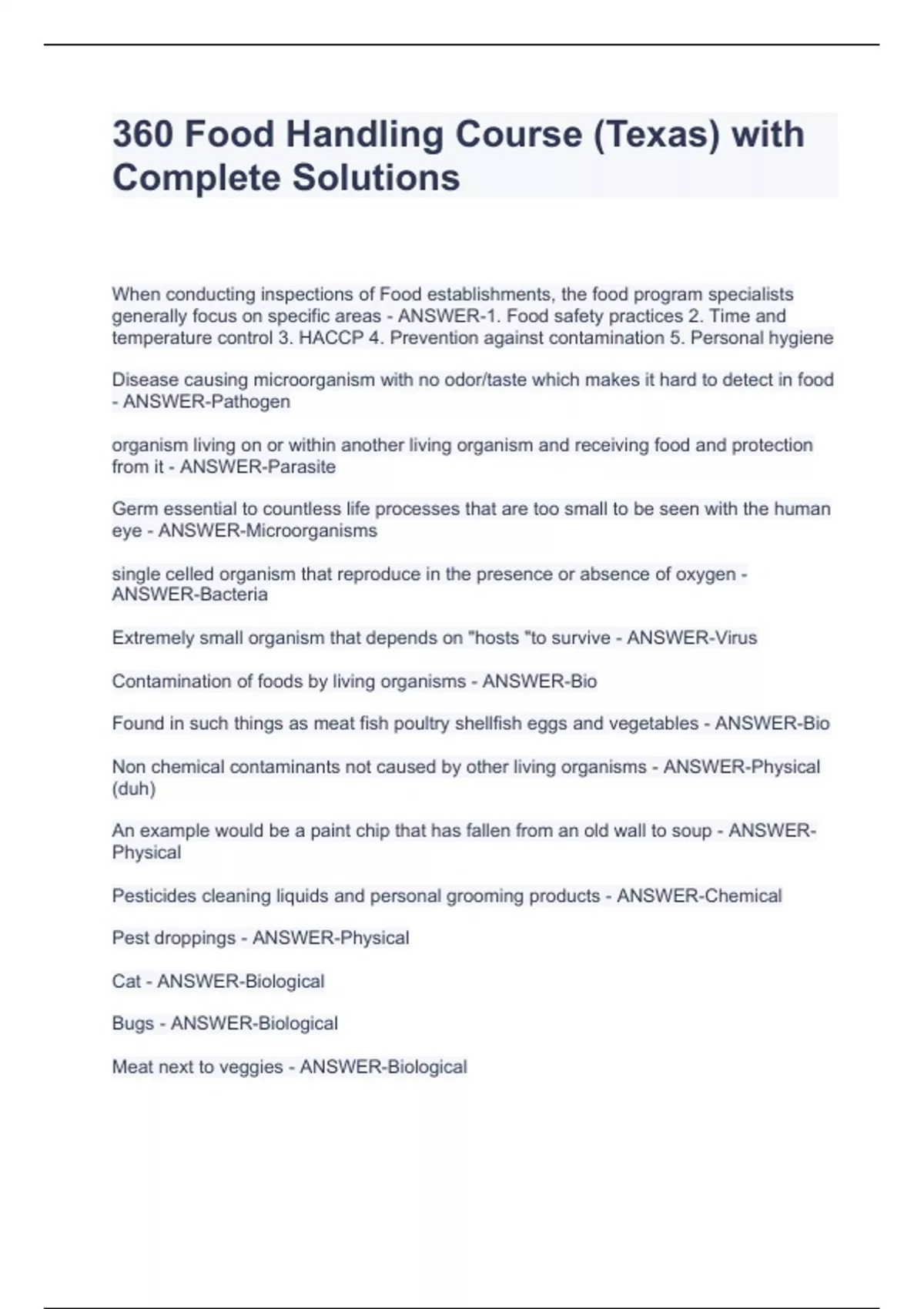 360 Food Handling Course (Texas) with Complete Solutions360 Food Handling Course (Texas) with Complete Solutions360 Food Handling Course (Texas) with Complete Solutions360 Food Handling Course (Texas) with Complete Solutions