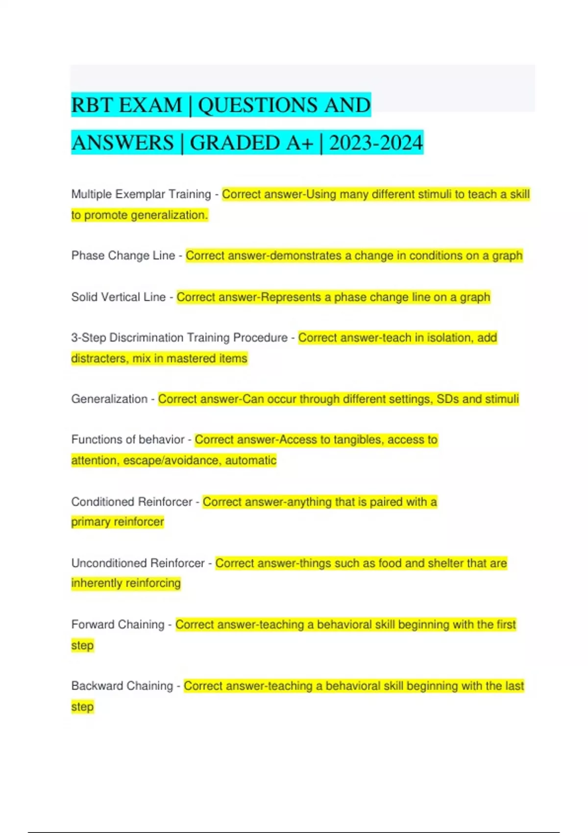 RBT EXAM | QUESTIONS AND ANSWERS | GRADED A+ | Multiple Exemplar Training - Correct answer-Using many different stimuli to teach a skill to promote generalization. Phase Change Line - Correct answer-demonstrates a change in conditions on a graph Solid Vertical Line - Correct answer-Represents a phase change line on a graph 3-Step Discrimination Training Procedure - Correct answer-teach in isolation, add distracters, mix in mastered items Generalization - Correct answer-Can occur through different settings, SDs and stimuli Functions of behavior - Correct answer-Access to tangibles, access to attention, escape/avoidance, automatic Conditioned Reinforcer - Correct answer-anything that is paired with a primary reinforcer Unconditioned Reinforcer - Correct answer-things such as food and shelter that are inherently reinforcing Forward Chaining - Correct answer-teaching a behavioral skill beginning with the first step Backward Chaining -