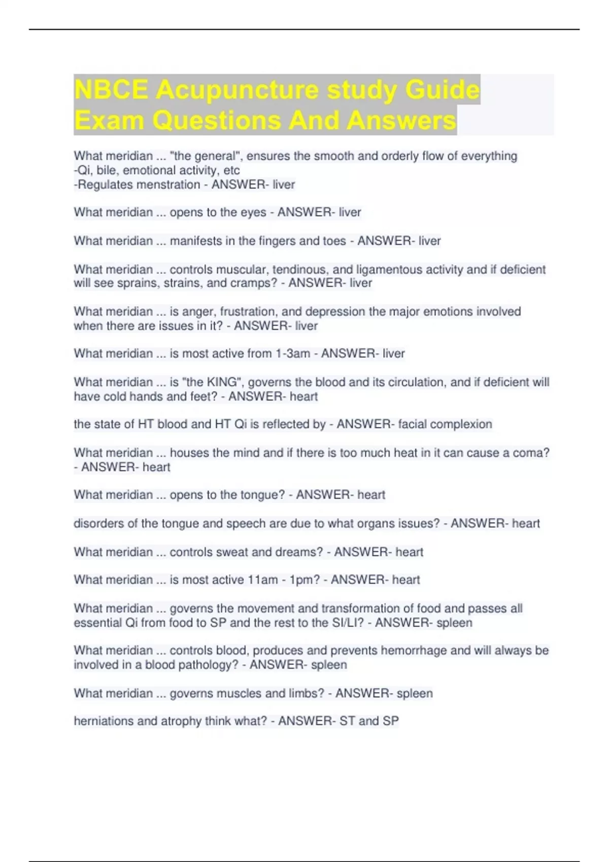 NBCE Acupuncture study Guide Exam Questions And Answers What meridian ... "the general", ensures the smooth and orderly flow of everything -Qi, bile, emotional activity, etc -Regulates menstration - ANSWER- liver What meridian ... opens to the eyes - ANSWER- liver What meridian ... manifests in the fingers and toes - ANSWER- liver What meridian ... controls muscular, tendinous, and ligamentous activity and if deficient will see sprains, strains, and cramps? - ANSWER- liver What meridian ... is anger, frustration, and depression the major emotions involved when there are issues in it? - ANSWER- liver What meridian ... is most active from 1-3am - ANSWER- liver What meridian ... is "the KING", governs the blood and its circulation, and if deficient will have cold hands and feet? - ANSWER- heart the state of HT blood and HT Qi is reflected by - ANSWER- facial complexion What meridian ... houses the mind and if there is too much heat in it can cause a coma? - ANSWER- heart What meridian ... opens to the tongue? - ANSWER- heart disorders of the tongue and speech are due to what organs issues? - ANSWER- heart What meridian ... controls sweat and dreams? - ANSWER- heart What meridian ... is most active 11am - 1pm? - ANSWER- heart What meridian ... governs the movement and transformation of food and passes all essential Qi from food to SP and the rest to the SI/LI? - ANSWER- spleen What meridian ... controls blood, produces and prevents hemorrhage and will always be involved in a blood pathology? - ANSWER- spleen What meridian ... governs muscles and limbs? - ANSWER- spleen herniations and atrophy think what? - ANSWER- ST and SP What meridian ... has strong lifting property? - ANSWER- spleen What meridian ... houses the intellect (yi) and digestion of information? - ANSWER- spleen What meridian ... is most active from 9am-11am? - ANSWER- spleen What meridian ... controls Qi and respiration? - ANSWER- lung what channel is affected by worry and grief? - ANSWER- lung What meridian ... regulates fluids/controls channels and blood vessels? - ANSWER- lung