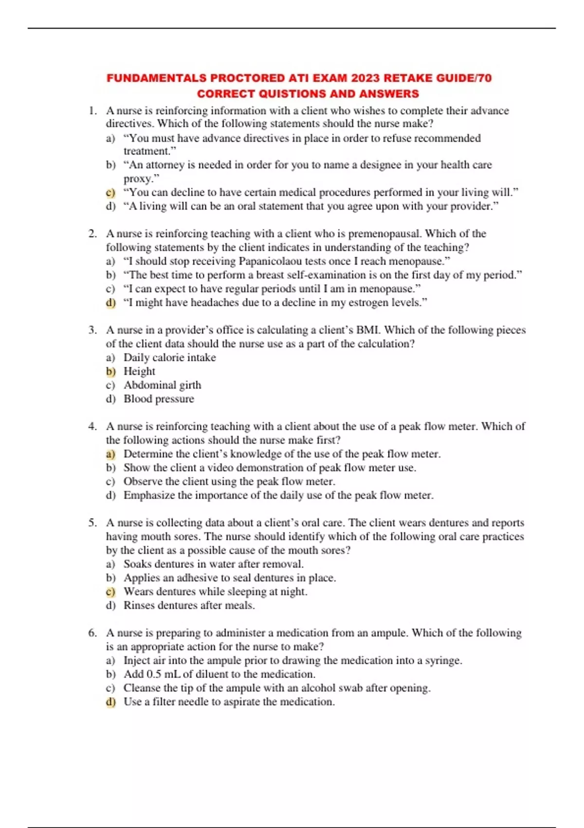 FUNDAMENTALS PROCTORED ATI EXAM 2023/2024 NEW RETAKE GUIDE/70 CORRECT QUISTIONS AND ANSWERS