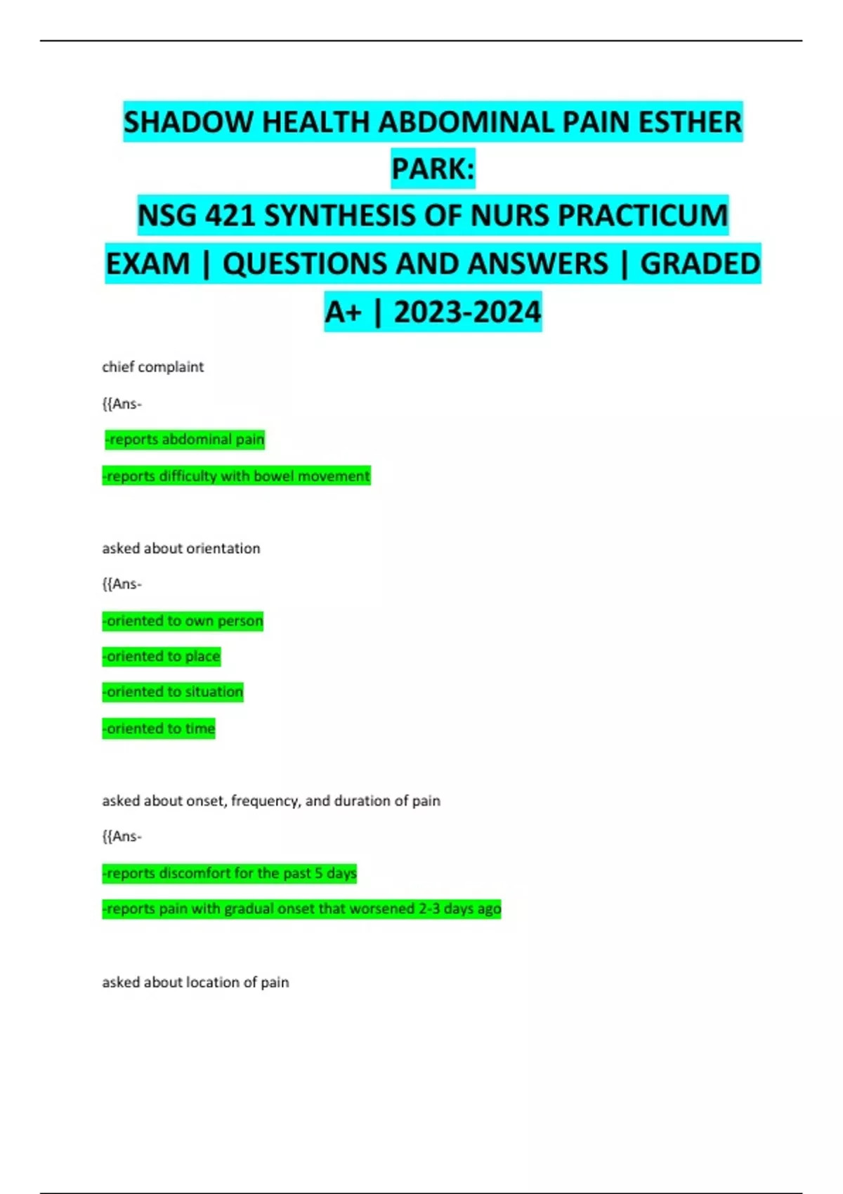 SHADOW HEALTH ABDOMINAL PAIN ESTHER PARK: NSG 421 SYNTHESIS OF NURS PRACTICUM EXAM | QUESTIONS AND ANSWERS | GRADED A+ | chief complaint {{Ans- -reports abdominal pain -reports difficulty with bowel movement asked about orientation {{Ans- -oriented to own person -oriented to place -oriented to situation -oriented to time asked about onset, frequency, and duration of pain {{Ans- -reports discomfort for the past 5 days -reports pain with gradual onset that worsened 2-3 days ago asked about location of pain