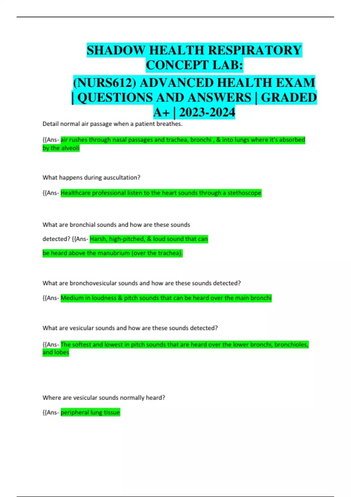 SHADOW HEALTH RESPIRATORY CONCEPT LAB: (NURS612) ADVANCED HEALTH EXAM | QUESTIONS AND ANSWERS | GRADED A+ | Detail normal air passage when a patient breathes. {{Ans- air rushes through nasal passages and trachea, bronchi , & into lungs where it's absorbed by the alveoli What happens during auscultation? {{Ans- Healthcare professional listen to the heart sounds through a stethoscope What are bronchial sounds and how are these sounds detected? {{Ans- Harsh, high-pitched, & loud sound that can be heard above the manubrium (over the trachea). What are bronchovesicular sounds and how are these sounds detected? {{Ans- Medium in loudness & pitch sounds that can be heard over the main bronchi What are vesicular sounds and how are these sounds detected? {{Ans- The softest and lowest in pitch sounds that are heard over the lower bronchi, bronchioles, and lobes Where are vesicular sounds normally heard