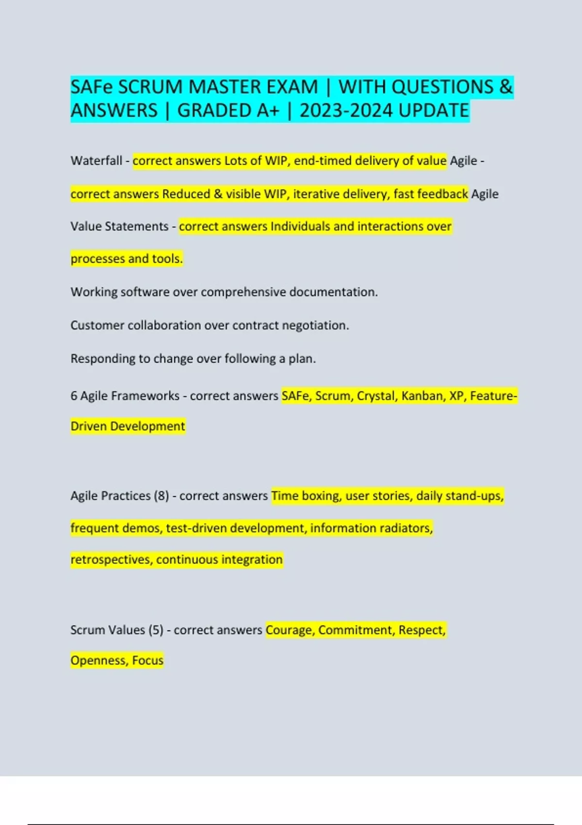 SAFe SCRUM MASTER EXAM | WITH QUESTIONS & ANSWERS | GRADED A+ | UPDATE Waterfall - correct answers Lots of WIP, end-timed delivery of value Agile - correct answers Reduced & visible WIP, iterative delivery, fast feedback Agile Value Statements - correct answers Individuals and interactions over processes and tools. Working software over comprehensive documentation. Customer collaboration over contract negotiation. Responding to change over following a plan. 6 Agile Frameworks - correct answers SAFe, Scrum, Crystal, Kanban, XP, Feature- Driven Development Agile Practices (8) - correct answers Time boxing, user stories, daily stand-ups, frequent demos, test-driven development, information radiators, retrospectives, continuous integration Scrum Values (5) - correct answers Courage, Commitment, Respect, Openness, Focus