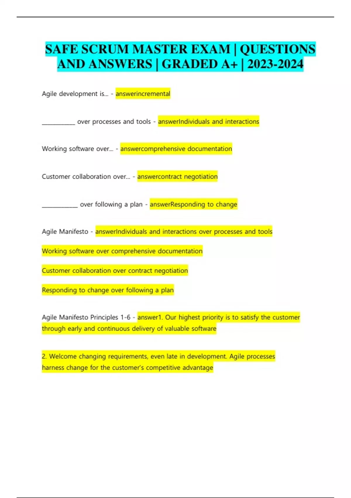 SAFE SCRUM MASTER EXAM | QUESTIONS AND ANSWERS | GRADED A+ | Agile development is... - answerincremental ____________ over processes and tools - answerIndividuals and interactions Working software over... - answercomprehensive documentation Customer collaboration over... - answercontract negotiation _____________ over following a plan - answerResponding to change Agile Manifesto - answerIndividuals and interactions over processes and tools Working software over comprehensive documentation Customer collaboration over contract negotiation Responding to change over following a plan Agile Manifesto Principles 1-6 - answer1. Our highest priority is to satisfy the customer through early and continuous delivery of valuable software 2. Welcome changing requirements, even late in development. Agile processes harness change for the customer's competitive advantage