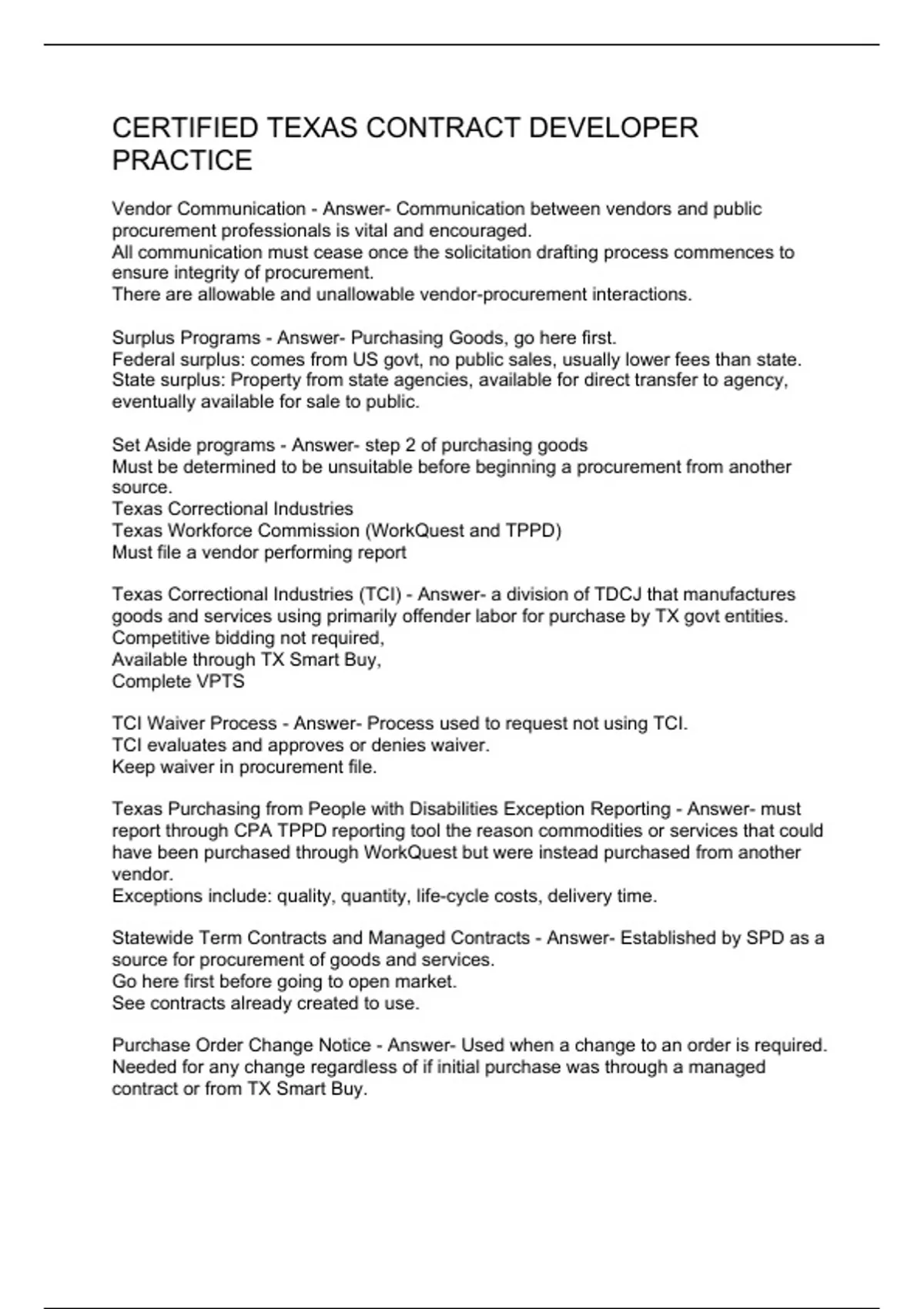 Vendor Communication - Answer- Communication between vendors and public procurement professionals is vital and encouraged. All communication must cease once the solicitation drafting process commences to ensure integrity of procurement. There are allowable and unallowable vendor-procurement interactions. Surplus Programs - Answer- Purchasing Goods, go here first. Federal surplus: comes from US govt, no public sales, usually lower fees than state. State surplus: Property from state agencies, available for direct transfer to agency, eventually available for sale to public. Set Aside programs - Answer- step 2 of purchasing goods Must be determined to be unsuitable before beginning a procurement from another source. Texas Correctional Industries Texas Workforce Commission (WorkQuest and TPPD) Must file a vendor performing report Texas Correctional Industries (TCI) - Answer- a division of TDCJ that manufactures goods and services using primarily offender labor for purchase by TX govt entities. Competitive bidding not required, Available through TX Smart Buy, Complete VPTS TCI Waiver Process - Answer- Process used to request not using TCI. TCI evaluates and approves or denies waiver. Keep waiver in procurement file. Texas Purchasing from People with Disabilities Exception Reporting - Answer- must report through CPA TPPD reporting tool the reason commodities or services that could have been purchased through WorkQuest but were instead purchased from another vendor. Exceptions include: quality, quantity, life-cycle costs, delivery time. Statewide Term Contracts and Managed Contracts - Answer- Established by SPD as a source for procurement of goods and services. Go here first before going to open market. See contracts already created to use. P
