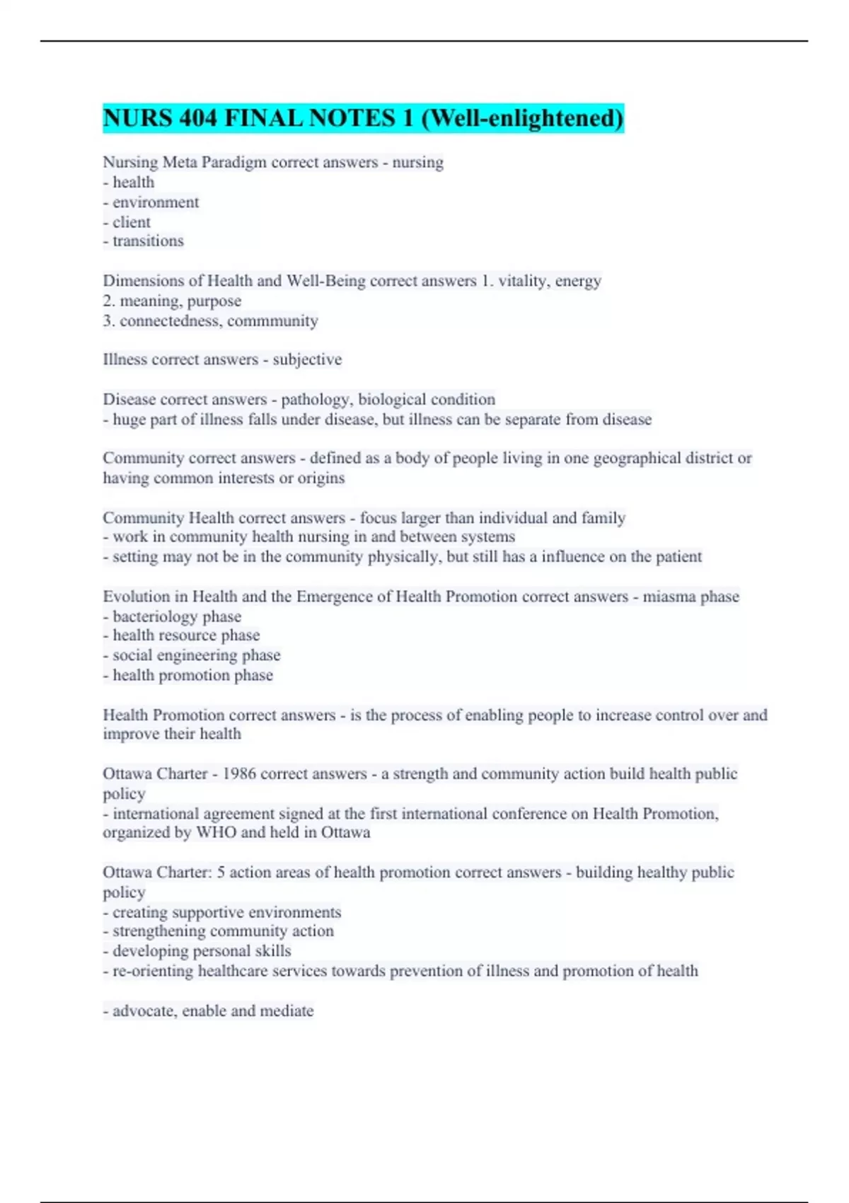 Nursing Meta Paradigm correct answers - nursing - health - environment - client - transitions Dimensions of Health and Well-Being correct answers 1. vitality, energy 2. meaning, purpose 3. connectedness, commmunity Illness correct answers - subjective Disease correct answers - pathology, biological condition - huge part of illness falls under disease, but illness can be separate from disease Community correct answers - defined as a body of people living in one geographical district or having common interests or origins Community Health correct answers - focus larger than individual and family - work in community health nursing in and between systems - setting may not be in the community physically, but still has a influence on the patient Evolution in Health and the Emergence of Health Promotion correct answers - miasma phase - bacteriology phase - health resource phase - social engineering phase - health promotion phase Health Promotion correct answers - is the process of enabling people to increase control over and improve their health Ottawa Charter - 1986 correct answers - a strength and community action build health public policy - international agreement signed at the first international conference on Health Promotion, organized by WHO and held in Ottawa Ottawa Charter: 5 action areas of health promotion correct answers - building healthy public policy - creating supportive environments - strengthening community action - developing personal skills - re-orienting healthcare services towards prevention of illness and promotion of health - advocate, enable and mediate
