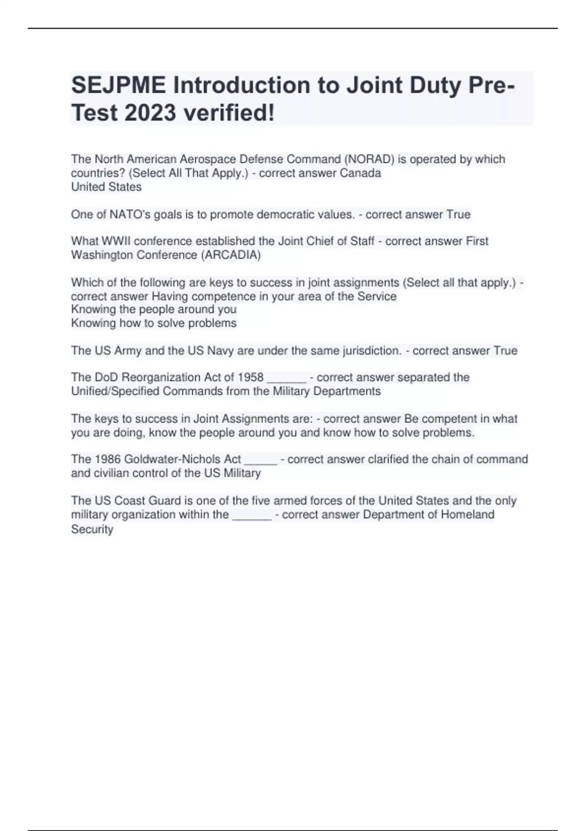 SEJPME Introduction to Joint Duty PreTest 2023 verified!