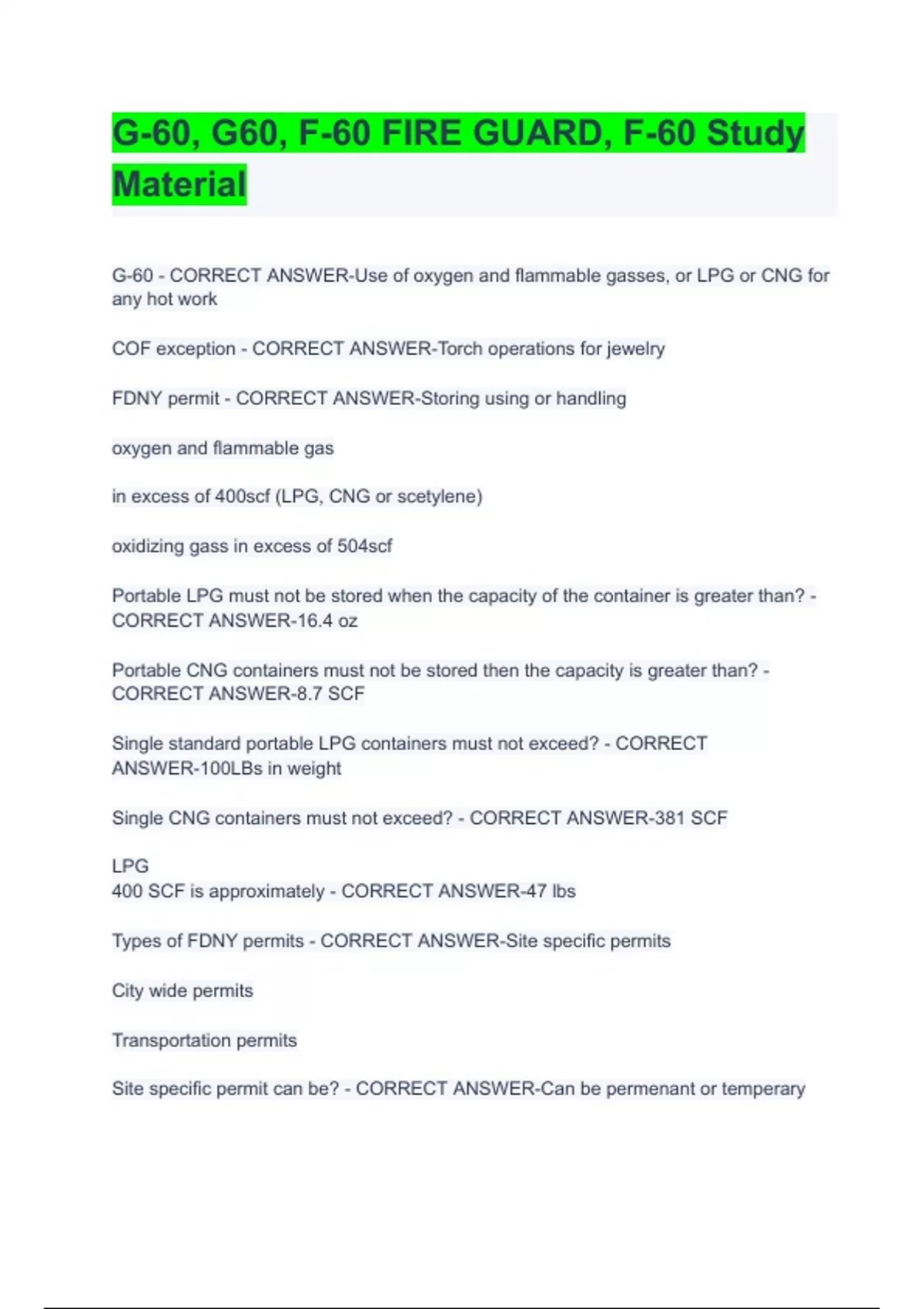 G-60, G60, F-60 FIRE GUARD, F-60 Study Material Already Passed COMPLETE SOLUTION 2023/2024. G-60 - CORRECT ANSWER-Use of oxygen and flammable gasses, or LPG or CNG for any hot work COF exception - CORRECT ANSWER-Torch operations for jewelry FDNY permit - CORRECT ANSWER-Storing using or handling oxygen and flammable gas in excess of 400scf (LPG, CNG or scetylene) oxidizing gass in excess of 504scf