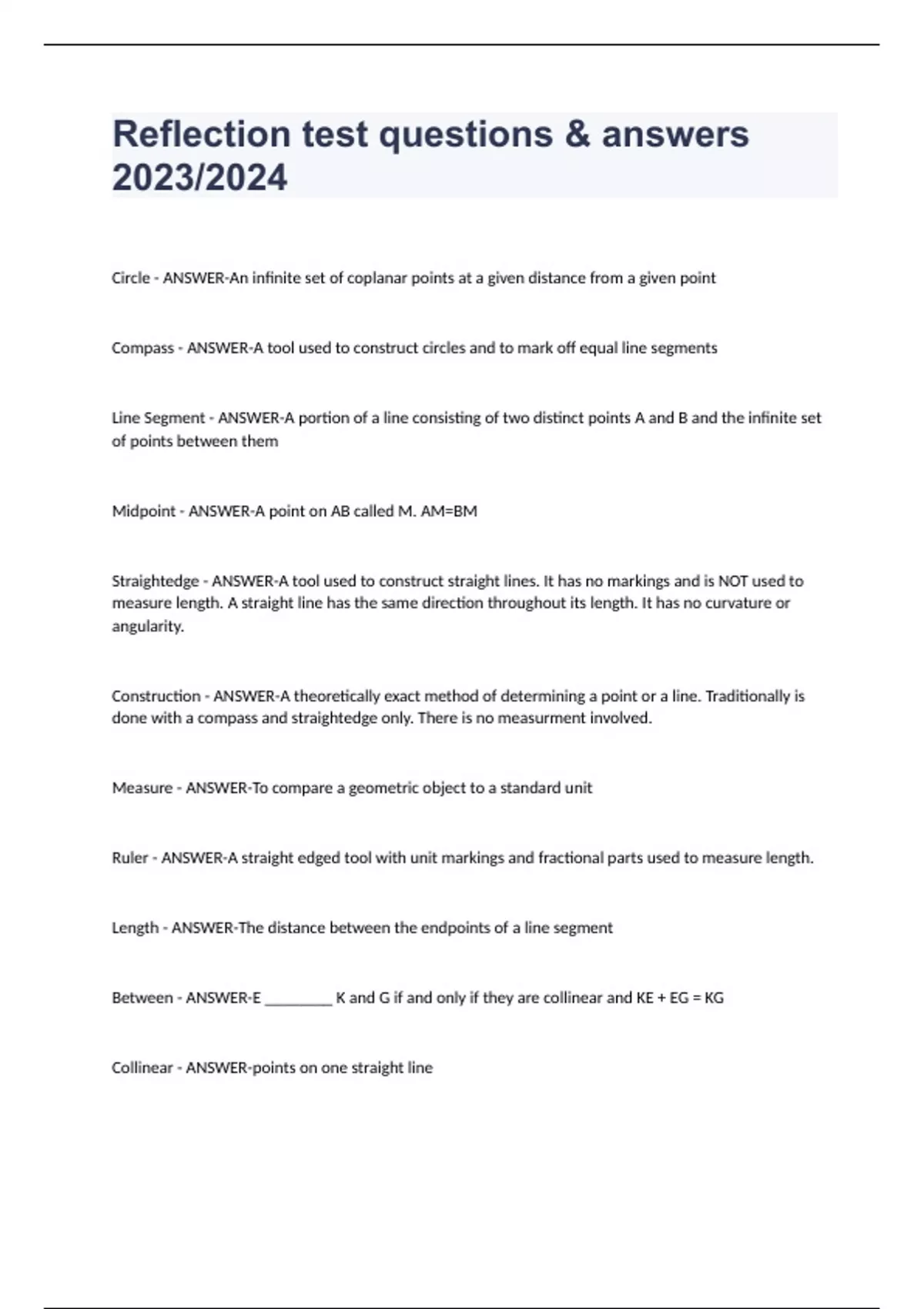 Reflection test questions & answers 2023/2024 Circle - ANSWER-An infinite set of coplanar points at a given distance from a given point Compass - ANSWER-A tool used to construct circles and to mark off equal line segments Line Segment - ANSWER-A portion of a line consisting of two distinct points A and B and the infinite set of points between them Midpoint - ANSWER-A point on AB called M. AM=BM Straightedge - ANSWER-A tool used to construct straight lines. It has no markings and is NOT used to measure length. A straight line has the same direction throughout its length. It has no curvature or angularity. Construction - ANSWER-A theoretically exact method of determining a point or a line. Traditionally is done with a compass and straightedge only. There is no measurment involved. Measure - ANSWER-To compare a geometric object to a standard unit Ruler - ANSWER-A straight edged tool with unit markings and fractional parts used to measure length. Length - ANSWER-The distance between the endpoints of a line segment Between - ANSWER-E ________ K and G if and only if they are collinear and KE + EG = KG Collinear - ANSWER-points on one straight line
