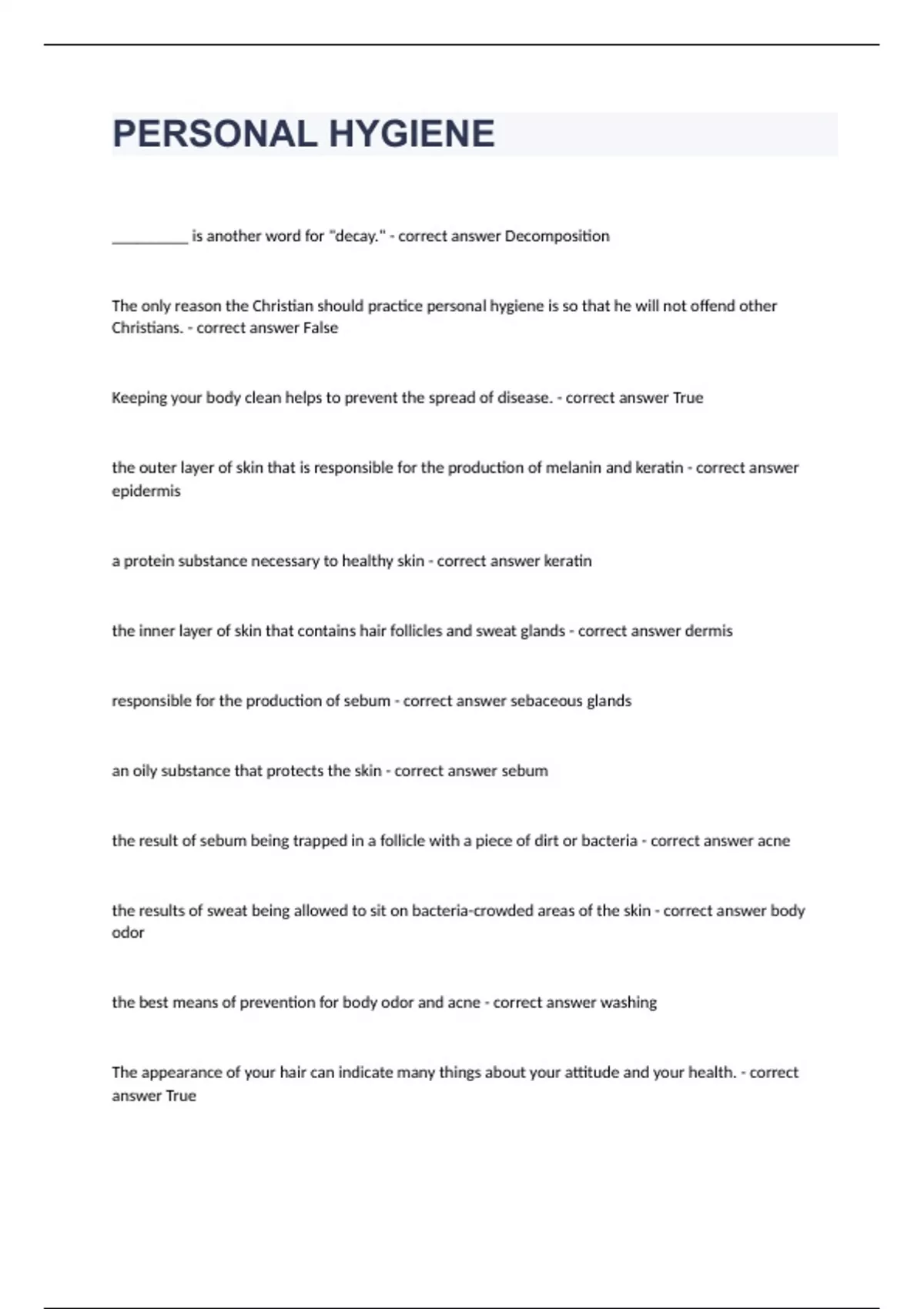 PERSONAL HYGIENE questions with 100% correct answers rated A+