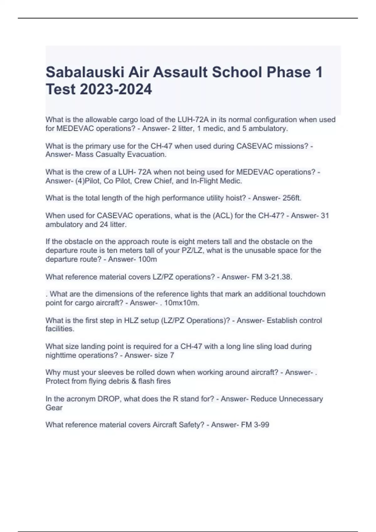 Sabalauski Air Assault School Phase 1 Test Questions and Answers