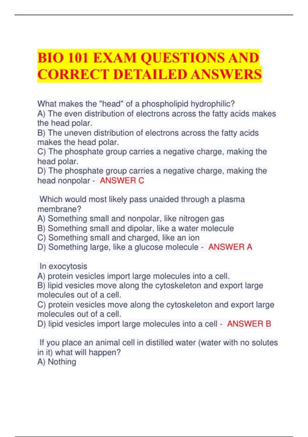 BIO 101 EXAM QUESTIONS AND CORRECT DETAILED ANSWERS What makes the "head" of a phospholipid hydrophilic? A) The even distribution of electrons across the fatty acids makes the head polar. B) The uneven distribution of electrons across the fatty acids makes the head polar. C) The phosphate group carries a negative charge, making the head polar. D) The phosphate group carries a negative charge, making the head nonpolar - ANSWER C Which would most likely pass unaided through a plasma membrane? A) Something small and nonpolar, like nitrogen gas B) Something small and dipolar, like a water molecule C) Something small and charged, like an ion D) Something large, like a glucose molecule - ANSWER A In exocytosis A) protein vesicles import large molecules into a cell. B) lipid vesicles move along the cytoskeleton and export large molecules out of a cell. C) protein vesicles move along the cytoskeleton and export large molecules out of a cell. D) lipid vesicles import large molecules into a cell - ANSWER B If you place an animal cell in distilled water (water with no solutes in it) what will happen? A) Nothing B) The cell will burst C) The cell will shrink D) the cell will swell but not burst - ANSWER B Chloroplasts and mitochondria share something with the nucleus that the other organelles do not. What is this shared function or component? A) They are the only organelles wrapped in a lipid-based membrane. B) They are the only organelles that are located in the cytosol. C) They are the only organelles that contain DNA. D) They are the only organelles not found in bacteria. - ANSWER C The cytoskeleton has several primary functions. The first and most obvious is it acts as an interior skeleton that supports the rest of the cell. What is another function of the cytoskeleton? A) It provides a communication network where chemo-electrical signals can be sent from one area of the cell to another. B) It creates a durable outer covering to increase the strength and rigidity of the cell. C) It provides a series of tracks along which vesicles can move throughout the cell. D) It connects one cell to another - ANSWER C A protein that will be transported to the plasma membrane will travel the following path A) ribosome, endoplasmic reticulum, vesicle, golgi apparatus, vesicle, plasma membrane B) ribosome, smooth endoplasmic reticulum, golgi apparatus, vesicle, plasma membrane C) endoplasmic reticulum, ribosome, golgi apparatus, vesicle, plasma membrane D) nucleus, vesicle,endoplasmic reticulum, vesicle, golgi apparatus, vesicle, plasma Membrane - ANSWER A Implanting pig extracellular matrix in a damaged human thigh can help muscle tissue regrow. True False - ANSWER True Non-functional cilia can result in many different problems including kidney damage. True False - ANSWER True Energy can be _______ but not __________. Chemicals ________ the biosphere but energy __________ the biosphere. A) converted, destroyed, flow through, is recycled in B) converted, destroyed, are recycled in, flows through C) destroyed, converted, flow through, is recycled in D) destroyed, converted, are recycled in, flows through - ANSWER B Which of the following is a waste product of photosynthesis? A) CO2 B) H2O C) O2 D) All of these - ANSWER C How does CO2 enter a plant? A) Through the roots B) Through the stroma C) Through the stomata D) Through the grana - ANSWER C Organize the following steps of the light reaction in order. A) Absorb sunlight, produce high-energy electron carriers, produce oxygen, split water B) Absorb sunlight, produce high-energy electron carriers, split water, produce oxygen C) Absorb sunlight, split water, produce oxygen, produce highenergy electron carriers D) Absorb sunlight, produce oxygen, split water, produce highenergy electron carriers - ANSWER C Rank these from smallest to largest A) grain of rice<HIV virus<E. coli bacteria< Human egg cell B) HIV virus < E. coli bacteria< Human egg cell grain of rice C) HIV virus < Human egg cell <E. coli bacteria< grain of rice D) E. coli bacteria <HIV virus, < Human egg cell< grain of rice - ANSWER B Which is not a requirement for natural selection to occur? A) Random mating B) Competition for limited re