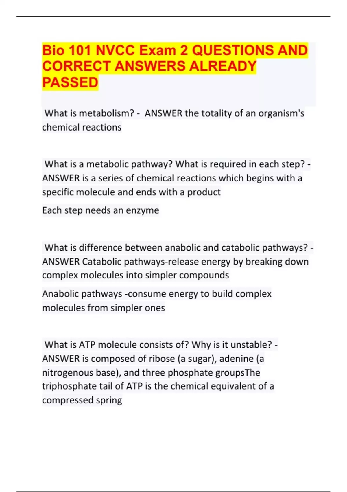 Bio 101 NVCC Exam 2 QUESTIONS AND CORRECT ANSWERS ALREADY PASSED What is metabolism? - ANSWER the totality of an organism's chemical reactions What is a metabolic pathway? What is required in each step? - ANSWER is a series of chemical reactions which begins with a specific molecule and ends with a product Each step needs an enzyme What is difference between anabolic and catabolic pathways? - ANSWER Catabolic pathways-release energy by breaking down complex molecules into simpler compounds Anabolic pathways -consume energy to build complex molecules from simpler ones What is ATP molecule consists of? Why is it unstable? - ANSWER is composed of ribose (a sugar), adenine (a nitrogenous base), and three phosphate groupsThe triphosphate tail of ATP is the chemical equivalent of a compressed spring What is a catalyst? - ANSWER is a chemical agent that speeds up a reaction without being consumed by the reaction What are the three things required for any reaction to occur? - ANSWER How does an enzyme lowers the activation energy of the substrate? - ANSWER Enzyme can speed up a reaction by lowering the EA barrier without itself being consumed, also by right orientation of molecules. Which factors affect enzyme activity? - ANSWER temperature pH substrate concentration How competitive and non competitive inhibitors differ from each other? - ANSWER Competitive inhibitors bind to the active site of an enzyme, competing with the substrate Noncompetitive inhibitors bind to another part of an enzyme, causing the enzyme to change shape and making the active site less effective What are the examples of inhibitors? - ANSWER toxins, poisons, pesticides, and antibiotics What is a feedback inhibition? - ANSWER the end product of a metabolic pathway shuts down the pathway What are the laws of thermodynamics? - ANSWER the energy of the universe is constant, Every energy transfer or transformation increases the entropy (heat) of the universe, What are the parts of an enzyme? - ANSWER substrate, active site What is the difference between oxidation and reduction? - ANSWER In oxidation, a substance loses electrons, or is oxidized In reduction, a substance gains electrons, or is reduced (the amount of positive charge is reduced) What is the ultimate source of energy? - ANSWER sun What is phosphorylation? What are the three ways to make ATP? - ANSWER Light energy is converted to ATP when the electrons (oxidation) from chlorophyll pass through a system of carrier molecules Glycolysis, Citric Acid Cycle, Oxidative phosphorylation What are the endproducts of glycolysis? - ANSWER is 2 ATP plus 2 NADH per glucose molecule What are the products of citric acid cycle? - ANSWER 2 ATP, 6 NADH, 2 FADH2 What are the stages of cellular respiration? write a flow chart. - ANSWER Glycolysis> Aerobic respiration> The Krebs Cycle> The electron transport chain Which molecules act as electron carriers and bring the electrons to electron transport chain? - ANSWER What is the difference between fermentation and cellular respiration? - ANSWER Cellular Respiration- produces massive amounts of ATP, Needs oxygen, thought to be evolved after fermentaiton, final electron acceptor is oxygen Fermentation- Produces little ATP, No oxygen, came first, final electron acceptor is pyurvate What are the two types of fermentation? What are the products of fermentation? - ANSWER alcohol fermentationpyruvate is converted to ethanol lactic acid fermentation- pyruvate is reduced by NADH, forming lactate as an end product, with no release of CO2 Products: alcohol, carbon dioxide and lactic acid What are lipids and proteins broken down into? - ANSWER glucose and amino acids What is the difference between heterotrophs and autotrophs? Give example of each. - ANSWER Heterotrophs obtain their