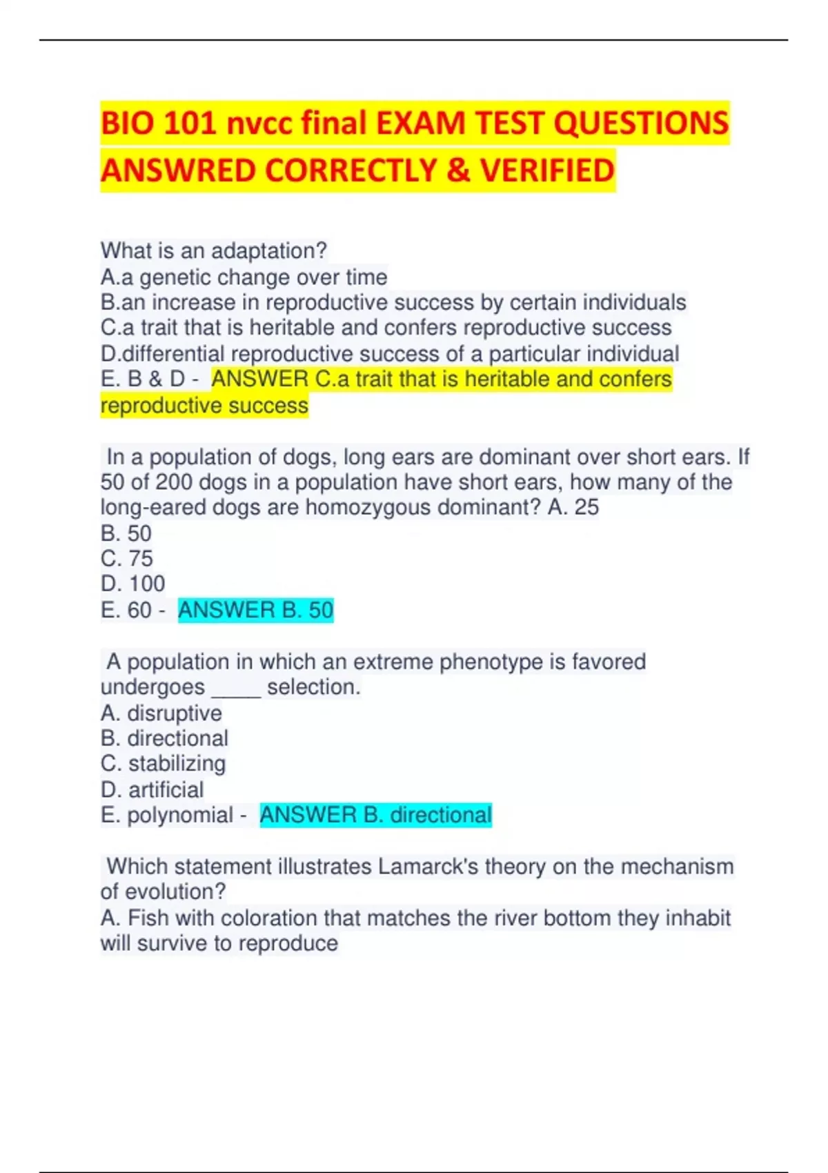 BIO 101 nvcc final EXAM TEST QUESTIONS ANSWRED CORRECTLY & VERIFIED What is an adaptation? A.a genetic change over time B.an increase in reproductive success by certain individuals C.a trait that is heritable and confers reproductive success D.differential reproductive success of a particular individual E. B & D - ANSWER C.a trait that is heritable and confers reproductive success In a population of dogs, long ears are dominant over short ears. If 50 of 200 dogs in a population have short ears, how many of the long-eared dogs are homozygous dominant? A. 25 B. 50 C. 75 D. 100 E. 60 - ANSWER B. 50 A population in which an extreme phenotype is favored undergoes ____ selection. A. disruptive B. directional C. stabilizing D. artificial E. polynomial - ANSWER B. directional Which statement illustrates Lamarck's theory on the mechanism of evolution? A. Fish with coloration that matches the river bottom they inhabit will survive to reproduce B. Plants that can survive in less light will become the dominant species in shaded areas C. Birds with bright colors will attract more mates and pass on the colorful plumage D. A man who routinely shaves the hair off his head will have sons who become bald E. Giraffes with longer necks survived and reproduced faster because they could reach a better food source - ANSWER D. A man who routinely shaves the hair off his head will have sons who become bald What is the Hardy-Weinberg equation? - ANSWER P+Q=1, p2+2pq+q2=1 Boa constrictors have tiny pelvic girdles and leg bones inside their bodies. Because these structures are nonfunctional "evolutionary baggage," they are called: A. convergent B. analogous C. maladaptive D. homologous E. vestigial - ANSWER E. vestigial Which of the following are vestigial structures? A. fish fins B. vertebral columns in snakes C. pelvic bones of whales D. wings of bats E. hoofs of horses - ANSWER C. pelvic bones of whales Humans still have body hair even though it is greatly reduced and serves little function. The hair is a(n): A. analogous structure B. homologous structure C. vestigial structure D. adaptation E. mutation - ANSWER C. vestigial structure The human upper arm bone (the humerus) is structurally similar to the upper wing bone of a bat. The structural similarity is an example of: A. analogous structures B. homologous structures C. vestigial structures D. adaptation E. mutation - ANSWER B. homologous structures Sea squirts and lampreys, which are both aquatic animals, have a perforated pharynx, a ventral heart, and a notochord at some stage of development. These similarities are BEST explained by: A. artificial selection B. inheritance of acquired characteristics C. a common ancestry D. uniformitarianism E. the "Ladder of Nature - ANSWER C. a common ancestry The fact that whales have pelvic and leg bones indicates that: A. they probably evolved from fish B. ancestral whales had legs C. whales should have functional legs D. having a pelvis is advantageous E. whales did not evolve by natural selection - ANSWER B. ancestral whales had legs Of all the possible amino acids, all living organisms make use of only the same 20 amino acids. This supports the idea that: A. only a limited number of DNA mutations are possible B. bacteria, animals, and plants developed independently C. each species uses a unique set of amino acids D. plants and animals have a completely different ancestry E. all living things are derived from a single common ancestor - ANSWER E. all living things are derived from a single common ancestor Which of the following supports the idea that all organisms share a common ancestry? A. All cells use DNA as a cellular energy carrier B. All cells use ATP as the template for protein synthesis C. All cells use the same collection of lipids D. All cells use amino acids as a carrier of genetic information E. All cells have a similar biochemistry, including amino acids, nucleic acids, and ATP - ANSWER E. All cells have a similar biochemistry, including amino acids, nucleic acids, and ATP Strong evidence for the common ancestry of all vertebrates is: A. they all have legs B. their means of reproduction C. the similarity of their embryological stages D. they all evolved from fish E. they all possess DNA - ANSWER C. the similarity of their embryological stages Most commercial pesticides are effective for only two or three years because: A. new pests invade the area B. the chemicals induce mutations that provide immunity C. the chemicals mutate and become ineffective D. the pests learn to hide when the chemicals are being applied E. those pests born with mutations that provide immunity will survive and reproduce - ANSWER E. those pests born with mutations that provide immunity will survive and reproduce Which of the following would you predict would evolve in guppies that are taken from streams in Trinidad with predators and put into streams lacking predators? A. Male guppies will become more colorful B. Male guppies will become less colorful C. Male guppies will not change in coloration D. Guppies would evolve to have females avoid more colorful males E. Guppies would evolve to have females prefer less colorful males - ANSWER A. Male guppies will become more colorful A population is defined as: A. all individuals of the same species located throughout the world B. all individuals of the same species located in a given geographic region C. all individuals of all species located throughout the world D. all individuals of all species located in a given country E. those individuals of the same species that have an identical genetic makeup - ANSWER D. all individuals of all species located in a given country The interaction of genes and