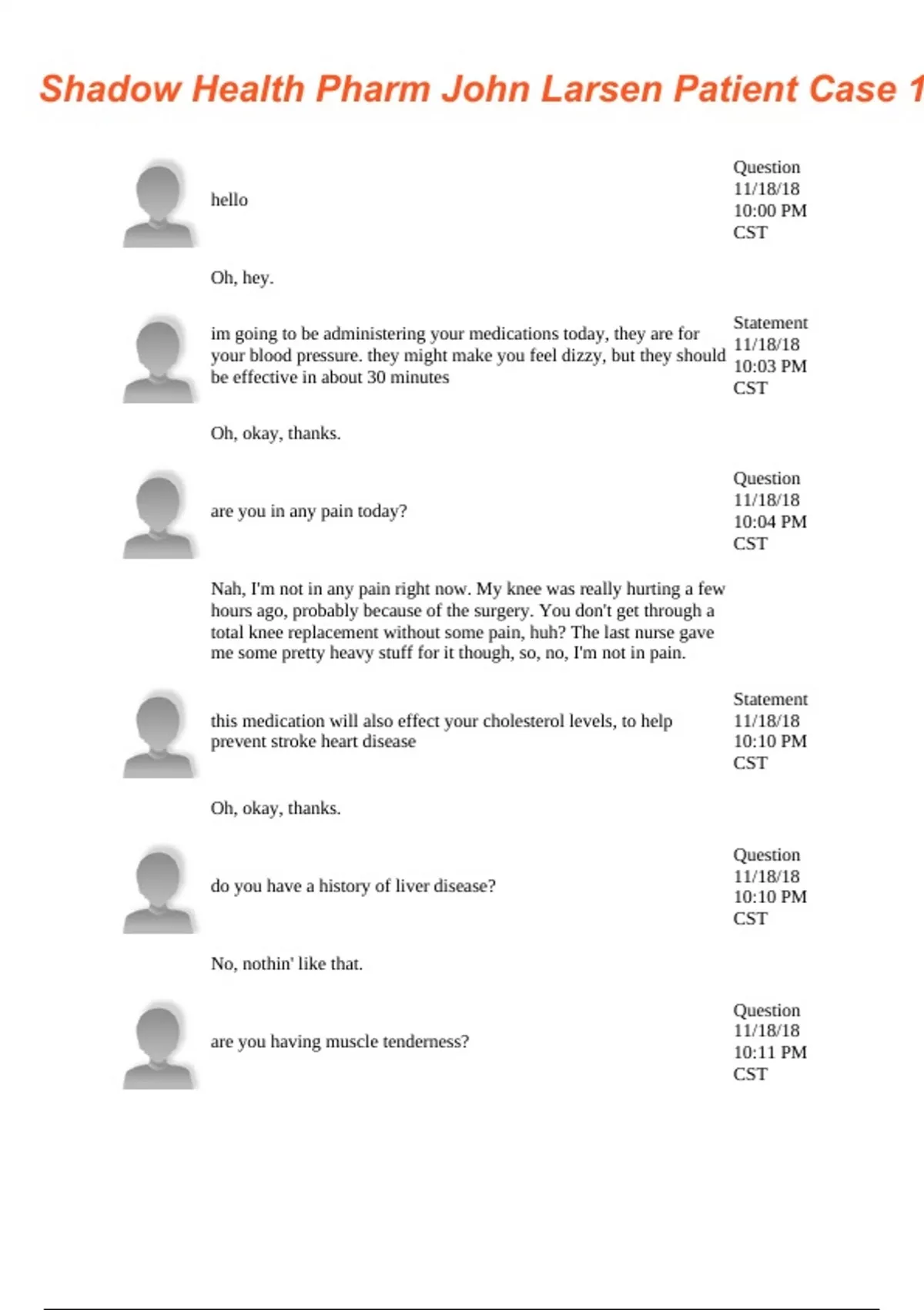 11/20/18 12:46 PM CST Can you rate your level of pain right now on a scale from 0-10? Question 11/20/18 12:52 PM CST I guess a 1 or 2. I don't feel much on this heavy pain med they have me on. Checked intake and output before giving medication Exam Action