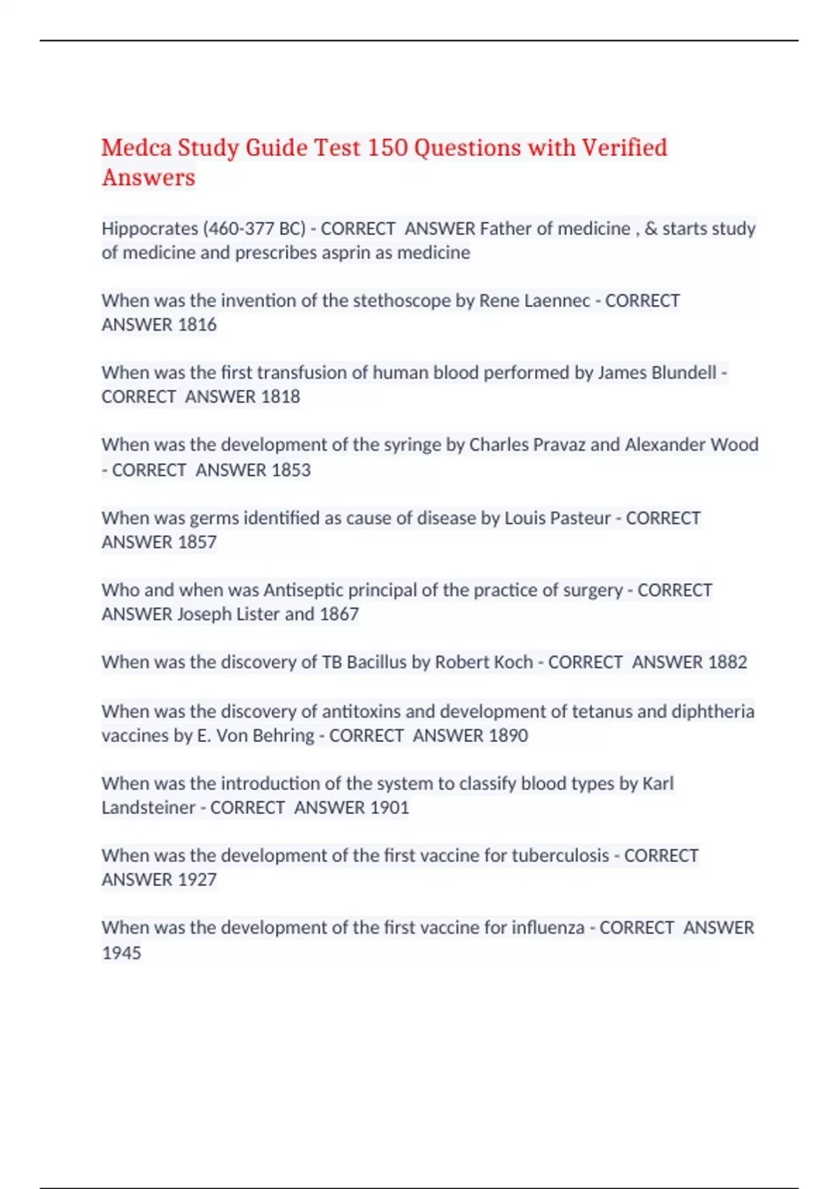 Medca Study Guide Test 150 Questions with Verified Answers Hippocrates (460-377 BC) - CORRECT ANSWER Father of medicine , & starts study of medicine and prescribes asprin as medicine When was the invention of the stethoscope by Rene Laennec - CORRECT ANSWER 1816 When was the first transfusion of human blood performed by James Blundell - CORRECT ANSWER 1818 When was the development of the syringe by Charles Pravaz and Alexander Wood - CORRECT ANSWER 1853 When was germs identified as cause of disease by Louis Pasteur - CORRECT ANSWER 1857 Who and when was Antiseptic principal of the practice of surgery - CORRECT ANSWER Joseph Lister and 1867 When was the discovery of TB Bacillus by Robert Koch - CORRECT ANSWER 1882 When was the discovery of antitoxins and development of tetanus and diphtheria vaccines by E. Von Behring - CORRECT ANSWER 1890 When was the introduction of the system to classify blood types by Karl Landsteiner - CORRECT ANSWER 1901 When was the development of the first vaccine for tuberculosis - CORRECT ANSWER 1927 When was the development of the first vaccine for influenza - CORRECT ANSWER 1945 When did Francis Crick and James Watson work on structure of DNA molecules - CORRECT ANSWER 1953 When was the first development of the first vaccine for measles - CORRECT ANSWER 1964 When was the first vaccine for pneumonia - CORRECT ANSWER 1977 The DEA has to approve - CORRECT ANSWER Medicine In order for patients to obtain certain medications - CORRECT ANSWER Prescriptions are written topical administration - CORRECT ANSWER Onto the skin ( epicutaneous ) Enternal administration - CORRECT ANSWER By swallowing ( oral route ) parenteral administration - CORRECT ANSWER Into veins ( intravenous ) injection beneath the skin is called - CORRECT ANSWER Subcutaneous administration analgesic drugs - CORRECT ANSWER Medications that reduce/alleviate pain antianxiety drugs - CORRECT ANSWER Medication used to suppress anxiety and relax muscles Antibiotics - CORRECT ANSWER Stops the infection from producing organisms- PENICILLIN is a common medicine Anti fungal drug - CORRECT ANSWER Used to treat infections caused by fungus such as ringworm anti-inflammatory - CORRECT ANSWER Non steroidal anti inflammatory drugs (NASIDs) Sleeping Aids - CORRECT ANSWER Used to help with sleeping disorders AMBIEN - common medicine anesthetics - CORRECT ANSWER medicines that cause the loss of feeling ANESTHESIA Common anesthesia - CORRECT ANSWER Novocaine active records - CORRECT ANSWER patients who have been seen within the past 2-5 years New Patient - CORRECT ANSWER You havent been seen in the office in 3years Open booking - CORRECT ANSWER Gives patients times to come to the office to be seen Methods of filing - CORRECT ANSWER By Subject & By Date (of receipt) Duties of medical assistant - CORRECT ANSWER scheduling appointments, updating medical records, vital statics When obtaining medical record information patients should be - CORRECT ANSWER Discouraged to give irrelevant information Co-pay - CORRECT ANSWER Collected each time a patient is seen Insurance - CORRECT ANSWER Should be updated each visit Super bill - CORRECT ANSWER Document used to determine payment due ICD-9 - CORRECT ANSWER Codes used to identify patient diagnosis HMO (Health Maintenance Organization) - CORRECT ANSWER Patient pay fixed amount or periodic fee for medical care providers belonging to HMO Who offers more cost advantages when compared with traditional payment plans - CORRECT ANSWER HMO (Health Maintenance Organization) Taking vital signs means - CORRECT ANSWER Recording body temperature, blood pressure, respiration and pulse Normal vital signs can change due to - CORRECT ANSWER Age, Sex, Weight, Exercise and health conditions Average temp for healthy adult - CORRECT ANSWER 97.8 - 99.1 F Average BP for healthy adult - CORRECT ANSWER 120/80 Average Respiratory Rate for healthy adult - CORRECT ANSWER 16-20 reps per min Average Heart Rate (pulse) for healthy adult - CORRECT ANSWER 60-100 beats per min Equipment used to record vital signs - CORRECT ANSWER Thermometer (temperature Sphygmomanometer (blood pressure) Stethoscope Watch (measure pulse) body temperature refers to - CORRECT ANSWER The amount if heat produced and sustained by the body processes The metabolism of nutrients - CORRECT ANSWER Generates heat within the body The production and loss of heat are generated and controlled in the - CORRECT ANSWER Hypothalamus and the brainstem The average adult temperature is around - CORRECT ANSWER 98.6 taken orally Temperature taken under arm (axillary) is usually - CORRECT ANSWER 0.5 to 1 degrees lower than orally Temperature taken rectal can be - CORRECT ANSWER 0.5 - 1 degrees higher than orally Rectum temperature - CORRECT ANSWER Most accurate oral temperature can be affected by - CORRECT ANSWER Smoking, intake of food and drink, breathing Temperature measured orally is lower than - CORRECT ANSWER Rectal Core Body Temperatures Temperature taken under the arm - CORRECT ANSWER Are the lowest in temps Temperature will increase - CORRECT ANSWER With the intake of food or drinks that are calorie rich Temperatures drop - CORRECT ANSWER At night and throughout the night Poor sleep quality or insomnia can lead to - CORRECT ANSWER A decrease in temperature Sites used for temp measurements - CORRECT ANSWER Oral (mouth) Rectal (anus) Tympanic (ear) Axillary (arm) Vaginal (vagina) Forhead In the gut Over temporal artery Temperature vary depending on - CORRECT ANSWER Body part being measured Typical temps in the daytime for healthy adults - CORRECT ANSWER Oral about 98.6 A medical sign characterized by an increase of temperature above normal leavel - CORRECT ANSWER Fever A significant core body temperature increase (hyperthermia) or decrease in core body temperature (Hypothermia) - CORRECT ANSWER Core Body Temperature The lowest temperature attained by the body (low early in the morning) - CORRECT ANSWER Basal Body Temperature core temperature drops bel
