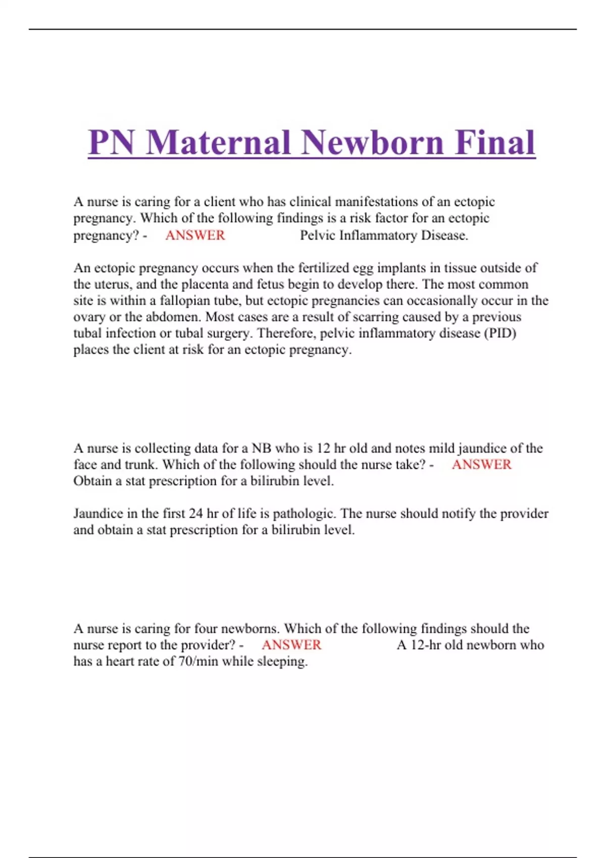 PN Maternal Newborn Final A nurse is caring for a client who has clinical manifestations of an ectopic pregnancy. Which of the following findings is a risk factor for an ectopic pregnancy? - ANSWER Pelvic Inflammatory Disease. An ectopic pregnancy occurs when the fertilized egg implants in tissue outside of the uterus, and the placenta and fetus begin to develop there. The most common site is within a fallopian tube, but ectopic pregnancies can occasionally occur in the ovary or the abdomen. Most cases are a result of scarring caused by a previous tubal infection or tubal surgery. Therefore, pelvic inflammatory disease (PID) places the client at risk for an ectopic pregnancy. A nurse is collecting data for a NB who is 12 hr old and notes mild jaundice of the face and trunk. Which of the following should the nurse take? - ANSWER Obtain a stat prescription for a bilirubin level. Jaundice in the first 24 hr of life is pathologic. The nurse should notify the provider and obtain a stat prescription for a bilirubin level. A nurse is caring for four newborns. Which of the following findings should the nurse report to the provider? - ANSWER A 12-hr old newborn who has a heart rate of 70/min while sleeping. An average heart rate for a newborn is 80 to 100/min while sleeping. A newborn's heart rate can increase to 180/min during episodes of crying. A heart rate less than 80/min is bradycardia and should be reported to the provider. A nurse is caring for a client who has trichomoniasis and a prescription for metronidazole. Which of the following instructions should the nurse reinforce with the client about the treatment plan? - ANSWER "You and your partner need to take the medication and use a condom during intercourse until cultures are negative." Trichomonas vaginalis is the organism that causes the sexually transmitted infection trichomoniasis. Both men and women can be infected with trichomoniasis. Clinical findings include yellowish to greenish, frothy, mucopurulent, copious discharge with an unpleasant odor, as well as itching, burning, or redness of the vulva and vagina. Trichomoniasis can be treated easily with metronidazole. However, for the treatment to work, it is important to make sure both sexual partners receive treatment to prevent reinfection. Instruct the client to use condoms during sexual intercourse while being treated. A nurse is assisting the plan of care for a client who is pregnant and is Rf-negative. In which of the following situations should the nurse administer Rh(D)Immune Globulin? - ANSWER At 28 weeks of gestation.