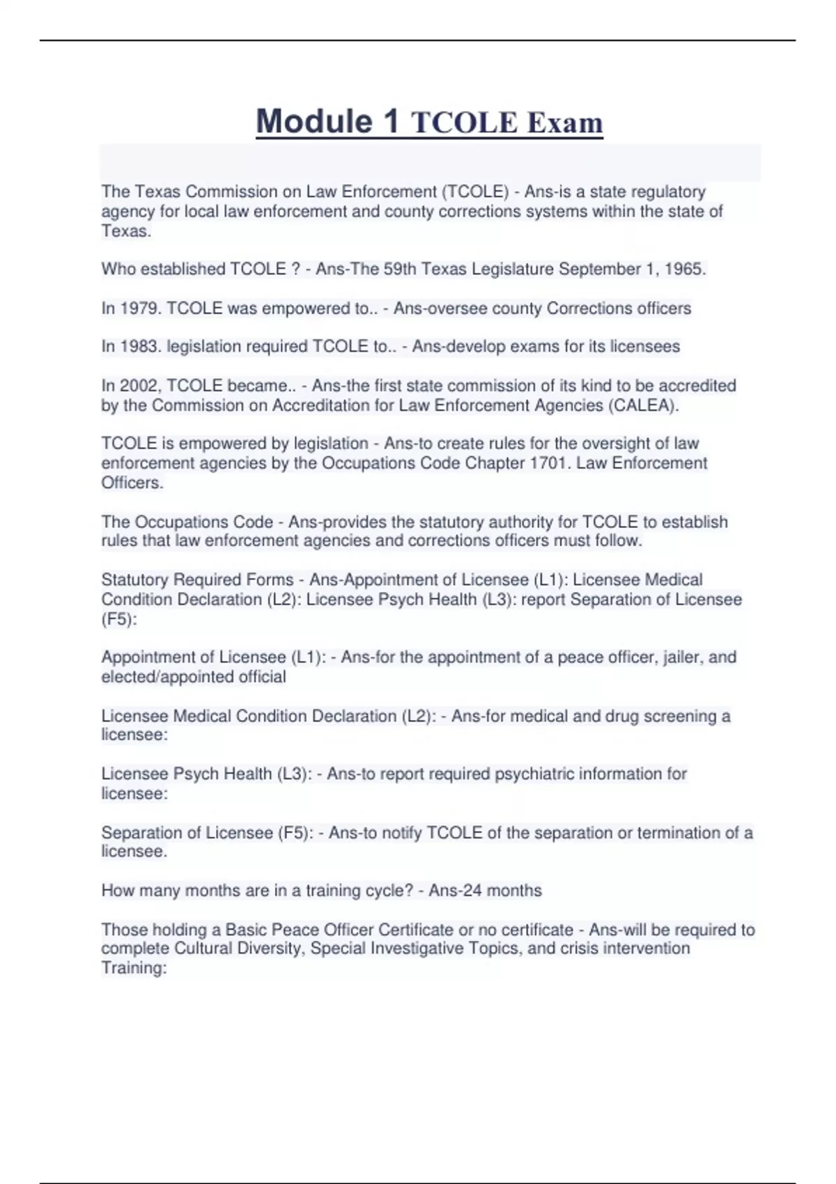 Module 1 TCOLE Exam The Texas Commission on Law Enforcement (TCOLE) - Ans-is a state regulatory agency for local law enforcement and county corrections systems within the state of Texas. Who established TCOLE ? - Ans-The 59th Texas Legislature September 1, 1965. In 1979. TCOLE was empowered to.. - Ans-oversee county Corrections officers In 1983. legislation required TCOLE to.. - Ans-develop exams for its licensees In 2002, TCOLE became.. - Ans-the first state commission of its kind to be accredited by the Commission on Accreditation for Law Enforcement Agencies (CALEA). TCOLE is empowered by legislation - Ans-to create rules for the oversight of law enforcement agencies by the Occupations Code Chapter 1701. Law Enforcement Officers. The Occupations Code - Ans-provides the statutory authority for TCOLE to establish rules that law enforcement agencies and corrections officers must follow. Statutory Required Forms - Ans-Appointment of Licensee (L1): Licensee Medical Condition Declaration (L2): Licensee Psych Health (L3): report Separation of Licensee (F5): Appointment of Licensee (L1): - Ans-for the appointment of a peace officer, jailer, and elected/appointed official Licensee Medical Condition Declaration (L2): - Ans-for medical and drug screening a licensee: Licensee Psych Health (L3): - Ans-to report required psychiatric information for licensee: Separation of Licensee (F5): - Ans-to notify TCOLE of the separation or termination of a licensee. How many months are in a training cycle? - Ans-24 months Those holding a Basic Peace Officer Certificate or no certificate - Ans-will be required to complete Cultural Diversity, Special Investigative Topics, and crisis intervention Training CONTINUES....