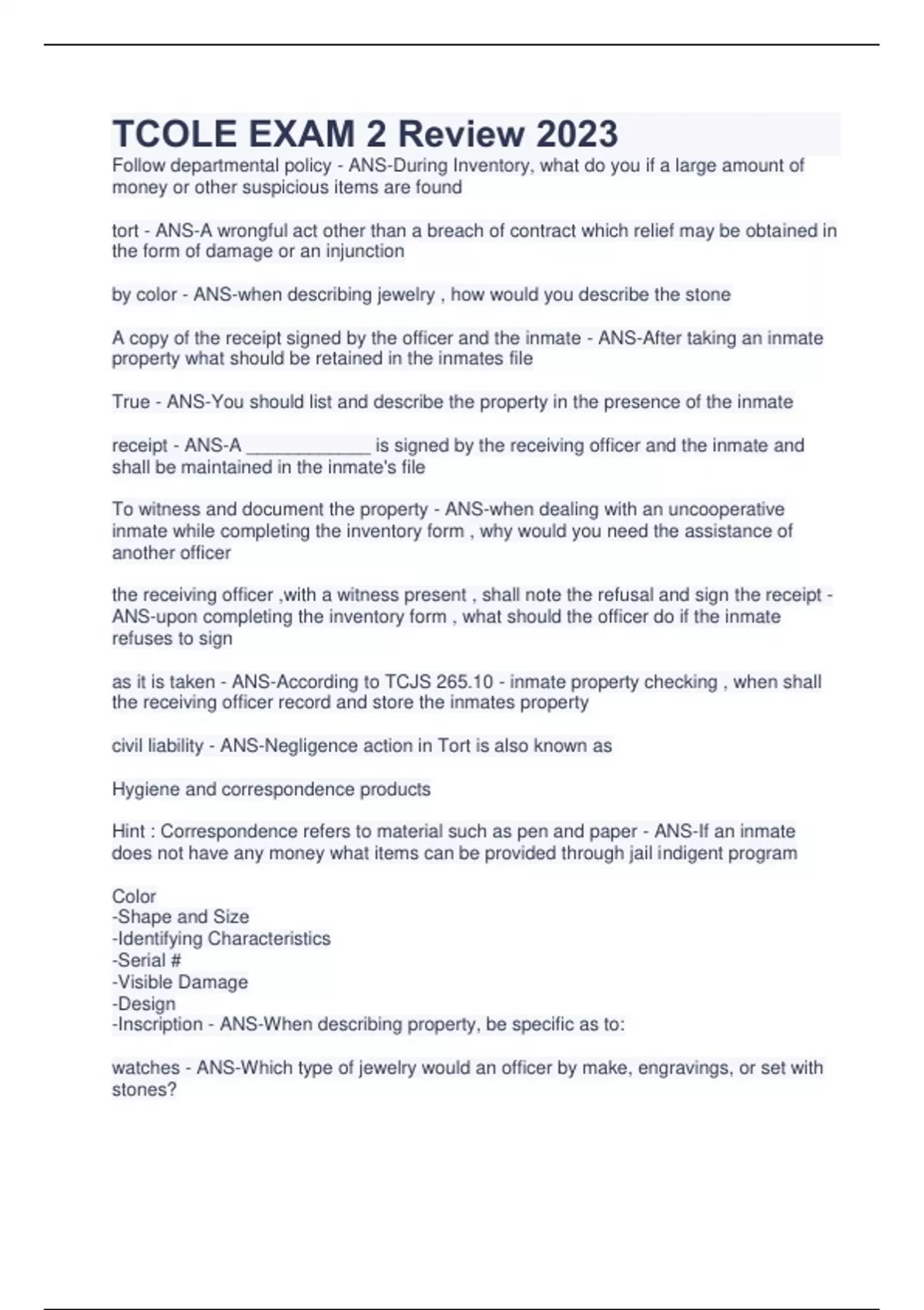 ANS-A ____________ is signed by the receiving officer and the inmate and shall be maintained in the inmate's file To witness and document the property - ANS-when dealing with an uncooperative inmate while completing the inventory form , why would you need the assistance of another officer the receiving officer ,with a witness present , shall note the refusal and sign the receipt - ANS-upon completing the inventory form , what should the officer do if the inmate refuses to sign as it is taken - ANS-According to TCJS 265.10 - inmate property checking , when shall the receiving officer record and store the inmates property civil liability - ANS-Negligence action in Tort is also known as Hygiene and correspondence products Hint : Correspondence refers to material such as pen and paper - ANS-If an inmate does not have any money what items can be provided through jail indigent program Color -Shape and Size -Identifying Characteristics -Serial # -Visible Damage -Design -Inscription - ANS-When describing property, be specific as to: watches - ANS-Which type of jewelry would an officer by make, engravings, or set with stones? true - ANS-A commissioners court may not use commissary proceeds to fund budgetary operating expenses privelege - ANS-the purchase of non-hygiene items is considered a ________. the inmate - ANS-if the balance in the inmates account is not enough to cover the purchases , who do you notify false - ANS-inmates shall be allowed access to another inmates money account 10 - ANS-Audits of the inmate commissary plan shall be submitted to the commission not later than ______ days following completion False - ANS-if an inmate does not have enough money in their account the inmate may be denied medical due to insufficient funds TCJS - ANS-Commissary must be operated in accordance with rules adopted by __________. - safe keeping of money - commissary - bonds/fines and court fees -medical - ANS-what are the 4 purposes of an inmate money account ? the commission - ANS-who approves the inmate commissary plan the sheriff/ sheriff's designee - ANS-who has exclusive control of the commissary funds ? yearly, annually - ANS-Provide for _______________ audits by the county auditory in accordance w/ the Local Government Code 351.0415 5 - ANS-The Sheriff or Sheriff's designee shall accept new bids to renew contracts of commissary suppliers every ________ years Inmate Commissary Plan ; submit the audits - ANS-The __________ shall include indicate type of services, frequency of services, methods for inmates obtaining items, provide yearly audits and ________________ the commission no later than 10 days following completion receipts and expenditures - ANS-records of inmate money accounts should include : the sheriff/ operator - ANS-who maintains records of inmate money accounts CONTINUES.....