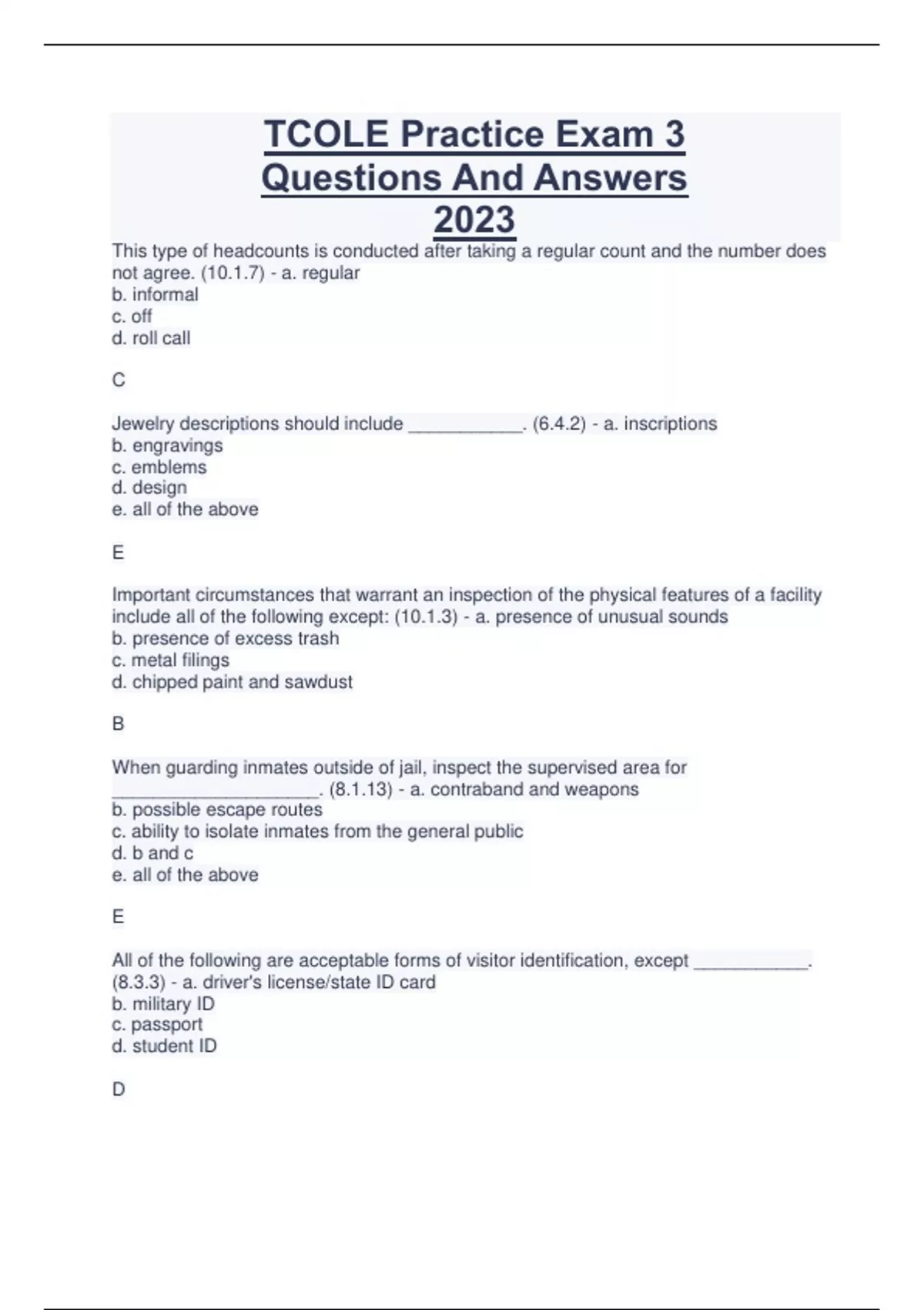 TCOLE Practice Exam 3 Questions And Answers 2023 This type of headcounts is conducted after taking a regular count and the number does not agree. (10.1.7) - a. regular b. informal c. off d. roll call C Jewelry descriptions should include ___________. (6.4.2) - a. inscriptions b. engravings c. emblems d. design e. all of the above E Important circumstances that warrant an inspection of the physical features of a facility include all of the following except: (10.1.3) - a. presence of unusual sounds b. presence of excess trash c. metal filings d. chipped paint and sawdust B When guarding inmates outside of jail, inspect the supervised area for ____________________. (8.1.13) - a. contraband and weapons b. possible escape routes c. ability to isolate inmates from the general public d. b and c e. all of the above E All of the following are acceptable forms of visitor identification, except ___________. (8.3.3) - a. driver's license/state ID card b. military ID c. passport d. student ID D All of the following are factors which make suicide more likely in a jail setting, except the person ___________. (5.3.3) - a. has a low status in the community b. has lost stabilizing resources c. is intoxicated or going through withdrawals d. receives threat of rape or same-sex rape has occurred A All of the following are qualifications of a trustee position, EXCEPT ___________. (7.2.15) - a. behavior b. quality of work habits c. type of work d. gender e. interview of inmate D State criminal law violations also constitute a liability situation. Of the following, which is NOT a criminal liability? (11.5.2) - a. Assault b. Theft c. Abuse of Official Capacity d. Vicarious liability e. Unlawful restraint D An important step when ensuring accounts have sufficient funds to cover expenses is to ___________. (6.5.4) - a. assume the inmate has sufficient funds b. check the amount of money that the inmate has in his or her account c. have the inmate call a family member to bring more money d. have the inmate use his or her debit card to pay for commissary items CONTINUES....