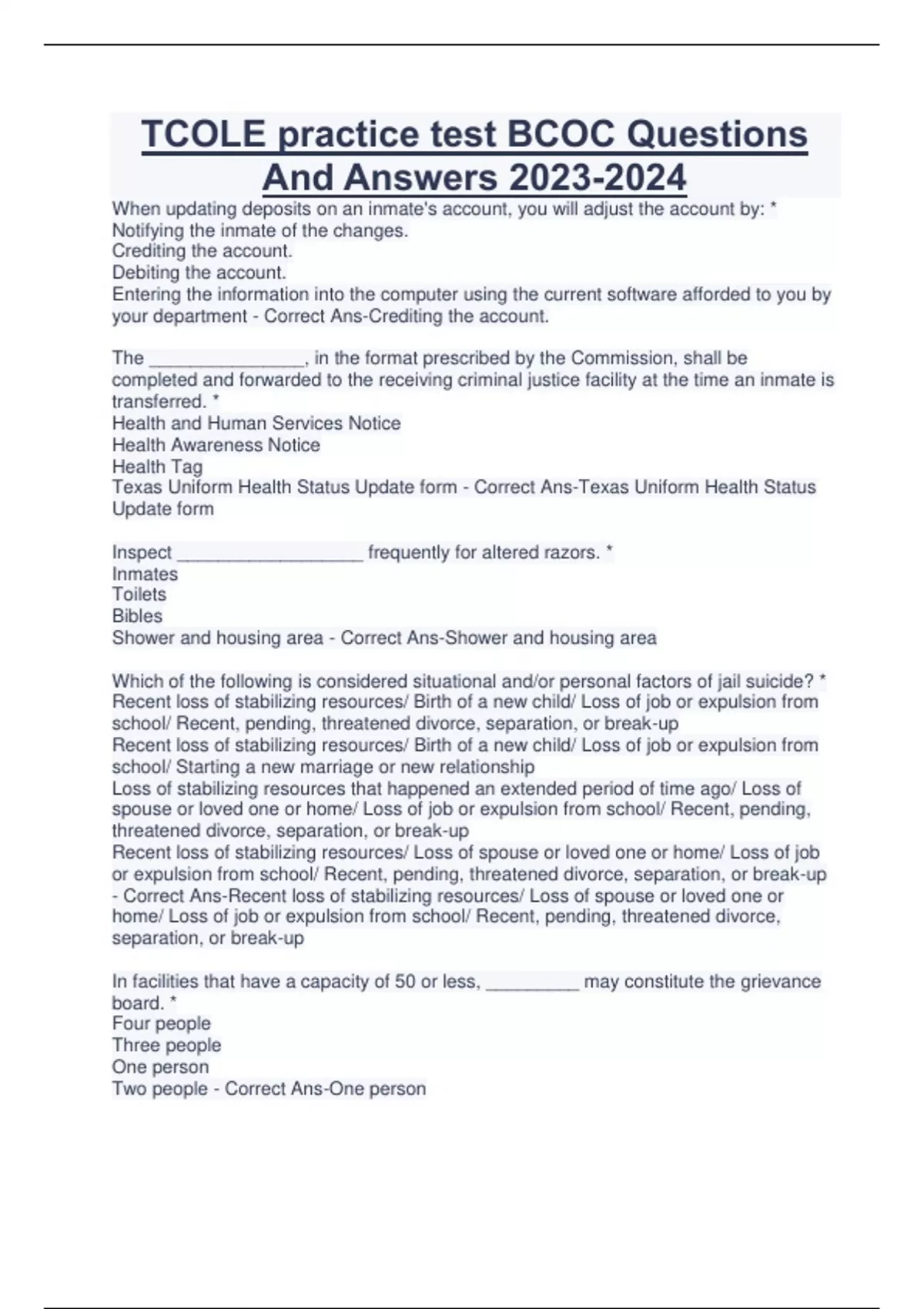 TCOLE practice test BCOC Questions And Answers When updating deposits on an inmate's account, you will adjust the account by: * Notifying the inmate of the changes. Crediting the account. Debiting the account. Entering the information into the computer using the current software afforded to you by your department - Correct Ans-Crediting the account. The _______________, in the format prescribed by the Commission, shall be completed and forwarded to the receiving criminal justice facility at the time an inmate is transferred. * Health and Human Services Notice Health Awareness Notice Health Tag Texas Uniform Health Status Update form - Correct Ans-Texas Uniform Health Status Update form Inspect __________________ frequently for altered razors. * Inmates Toilets Bibles Shower and housing area - Correct Ans-Shower and housing area Which of the following is considered situational and/or personal factors of jail suicide? * Recent loss of stabilizing resources/ Birth of a new child/ Loss of job or expulsion from school/ Recent, pending, threatened divorce, separation, or break-up Recent loss of stabilizing resources/ Birth of a new child/ Loss of job or expulsion from school/ Starting a new marriage or new relationship Loss of stabilizing resources that happened an extended period of time ago/ Loss of spouse or loved one or home/ Loss of job or expulsion from school/ Recent, pending, threatened divorce, separation, or break-up Recent loss of stabilizing resources/ Loss of spouse or loved one or home/ Loss of job or expulsion from school/ Recent, pending, threatened divorce, separation, or break-up - Correct Ans-Recent loss of stabilizing resources/ Loss of spouse or loved one or home/ Loss of job or expulsion from school/ Recent, pending, threatened divorce, separation, or break-up In facilities that have a capacity of 50 or less, _________ may constitute the grievance board. * Four people Three people One person Two people - Correct Ans-One person If an officer must search an inmate with a bandage, how would the officer check for contraband underneath the bandage? * Have medical personnel remove the bandage or have the inmate lift the bandage. The officer will remove the bandage. The officer will carefully remove the bandage under the guidance of medical personnel That is too much work, leave the bandage alone. - Correct Ans-Have medical personnel remove the bandage or have the inmate lift the bandage. When handling of blood or other potential pathogen evidence use protective equipment and place items in a ________. * Paper Bag. Paper Bad and then in a plastic bag. In the back of your car so you don't lose it. In an evidence locker. - Correct Ans-Paper Bag Law enforcement identification numbers are used for: * Court appearances Personal vendettas Tracking purposes Verification - Correct Ans-Tracking purposes The Texas Legislature created TCOLE in what year? * 1975 1979 1965 1969 - Correct Ans-1965 Inmates in administrative separation shall be provided access to a day room for at least ____ each day. Inmates in disciplinary separation shall be provided a shower ___. * One hour/ Daily Thirty Minutes/ Daily One hour/ Every other day Thirty Minutes/ Every other day - Correct Ans-One hour/ Every other day To check for wants and warrants throughout Texas and the nation, officers will perform _____ checks during the booking procedure. * TCIC/ NCIC TCJS TCOLE FBI database - Correct Ans-TCIC/ NCIC If there is an escape "in progress," what actions should be taken? * Notify a Supervisor/Order inmates to housing/Conduct a regular count/Account for all personnel CONTINUES...