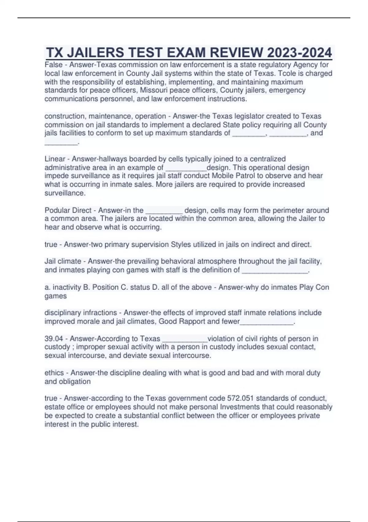 TX JAILERS TEST EXAM REVIEW False - Answer-Texas commission on law enforcement is a state regulatory Agency for local law enforcement in County Jail systems within the state of Texas. Tcole is charged with the responsibility of establishing, implementing, and maintaining maximum standards for peace officers, Missouri peace officers, County jailers, emergency communications personnel, and law enforcement instructions. construction, maintenance, operation - Answer-the Texas legislator created to Texas commission on jail standards to implement a declared State policy requiring all County jails facilities to conform to set up maximum standards of ________, _________, and ________. Linear - Answer-hallways boarded by cells typically joined to a centralized administrative area in an example of __________design. This operational design impede surveillance as it requires jail staff conduct Mobile Patrol to observe and hear what is occurring in inmate sales. More jailers are required to provide increased surveillance. Podular Direct - Answer-in the _________ design, cells may form the perimeter around a common area. The jailers are located within the common area, allowing the Jailer to hear and observe what is occurring. true - Answer-two primary supervision Styles utilized in jails on indirect and direct. Jail climate - Answer-the prevailing behavioral atmosphere throughout the jail facility, and inmates playing con games with staff is the definition of ________________. a. inactivity B. Position C. status D. all of the above - Answer-why do inmates Play Con games disciplinary infractions - Answer-the effects of improved staff inmate relations include improved morale and jail climates, Good Rapport and fewer_____________. 39.04 - Answer-According to Texas ___________violation of civil rights of person in custody ; improper sexual activity with a person in custody includes sexual contact, sexual intercourse, and deviate sexual intercourse. ethics - Answer-the discipline dealing with what is good and bad and with moral duty and obligation true - Answer-according to the Texas government code 572.051 standards of conduct, estate office or employees should not make personal Investments that could reasonably be expected to create a substantial conflict between the officer or employees private interest in the public interest. CONTIUES...