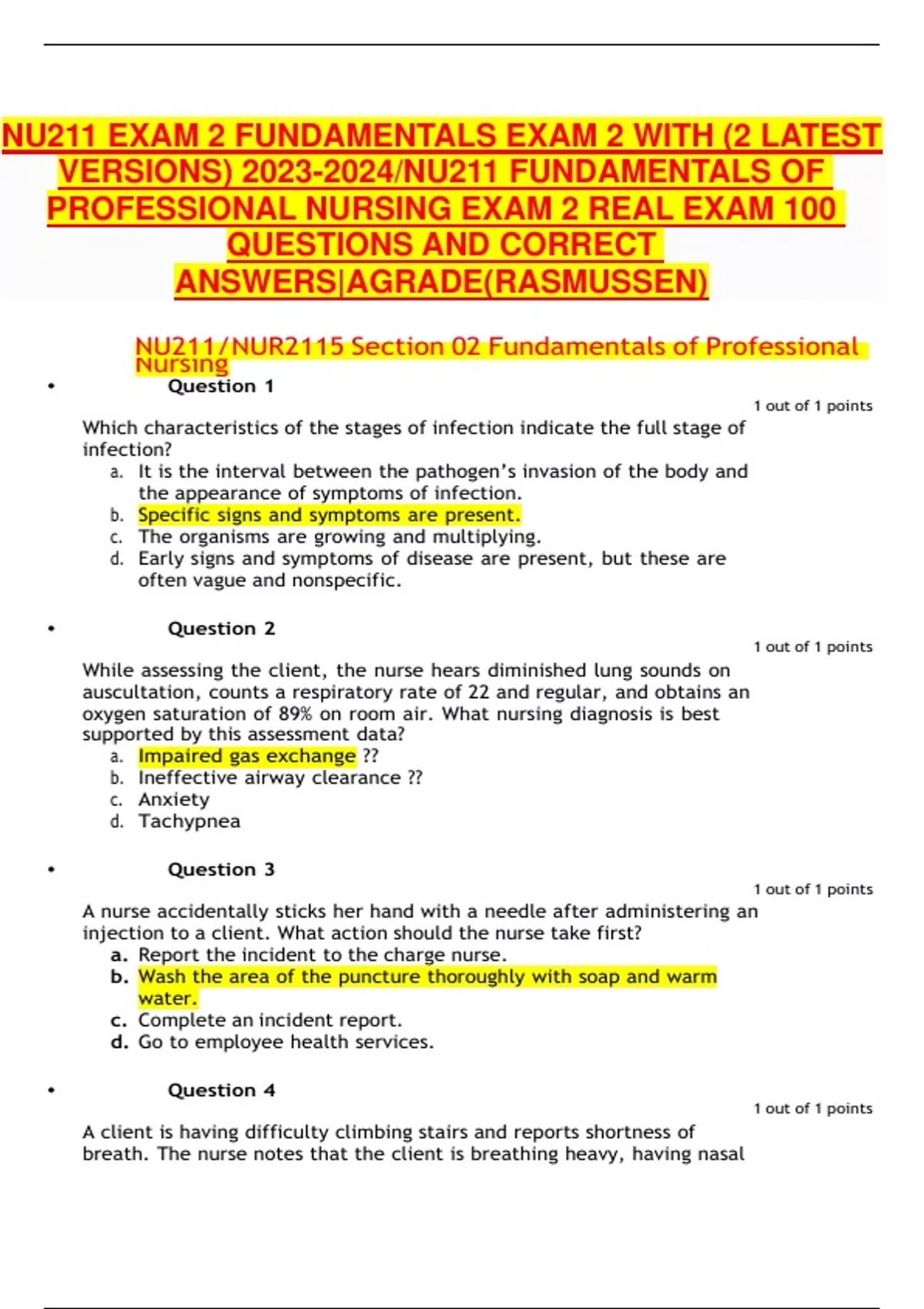 NU211 EXAM 2 FUNDAMENTALS EXAM 2 VERIFIED ANSWERS WITH (2 LATEST VERSIONS) /NU211 FUNDAMENTALS OF PROFESSIONAL NURSING EXAM 2 REAL EXAM 100 QUESTIONS AND CORRECT ANSWERS|AGRADE(RASMUSSEN)