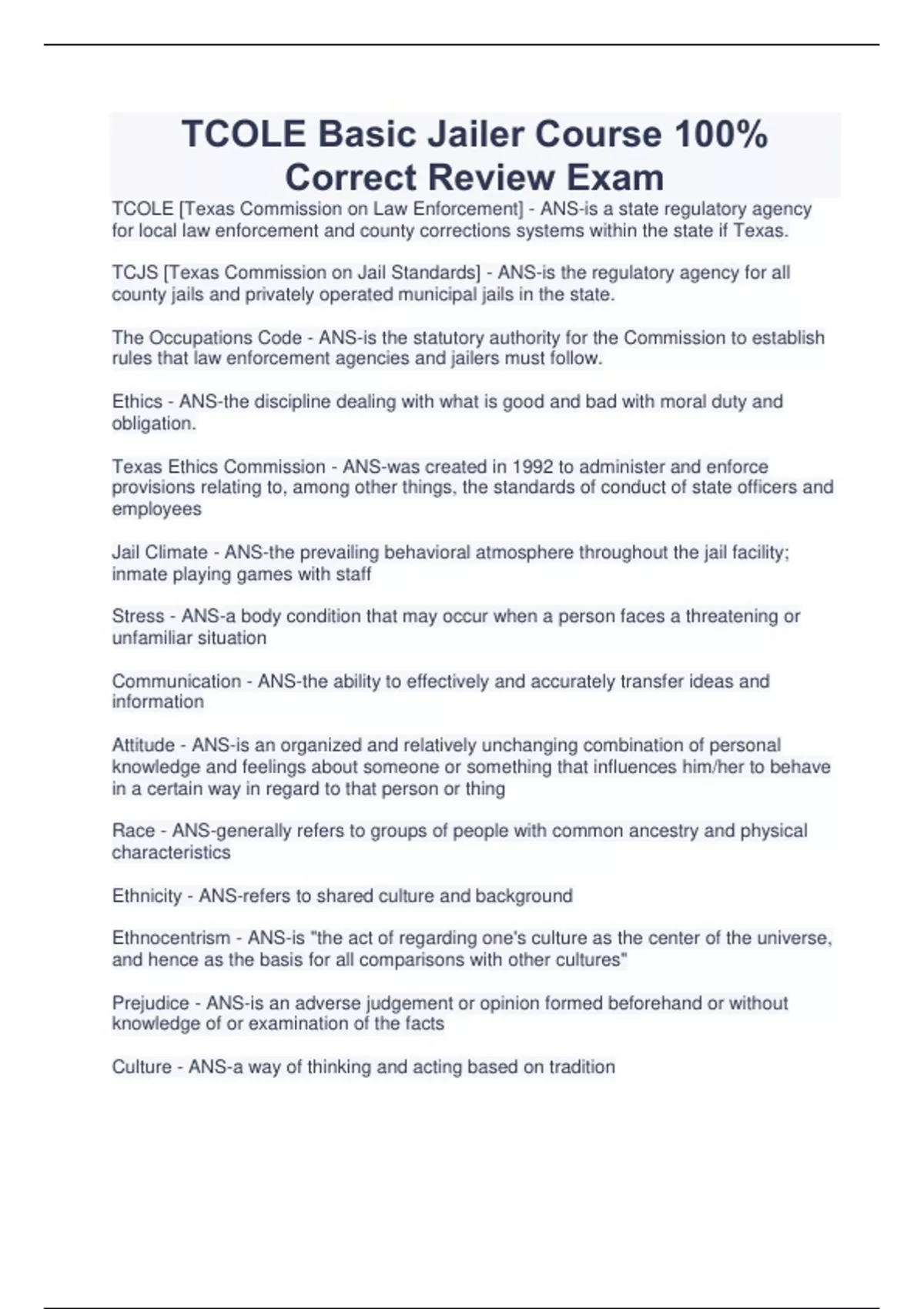 TCOLE Basic Jailer Course 100% Correct Review Exam TCOLE [Texas Commission on Law Enforcement] - ANS-is a state regulatory agency for local law enforcement and county corrections systems within the state if Texas. TCJS [Texas Commission on Jail Standards] - ANS-is the regulatory agency for all county jails and privately operated municipal jails in the state. The Occupations Code - ANS-is the statutory authority for the Commission to establish rules that law enforcement agencies and jailers must follow. Ethics - ANS-the discipline dealing with what is good and bad with moral duty and obligation. Texas Ethics Commission - ANS-was created in 1992 to administer and enforce provisions relating to, among other things, the standards of conduct of state officers and employees Jail Climate - ANS-the prevailing behavioral atmosphere throughout the jail facility; inmate playing games with staff Stress - ANS-a body condition that may occur when a person faces a threatening or unfamiliar situation Communication - ANS-the ability to effectively and accurately transfer ideas and information Attitude - ANS-is an organized and relatively unchanging combination of personal knowledge and feelings about someone or something that influences him/her to behave in a certain way in regard to that person or thing Race - ANS-generally refers to groups of people with common ancestry and physical characteristics Ethnicity - ANS-refers to shared culture and background Ethnocentrism - ANS-is "the act of regarding one's culture as the center of the universe, and hence as the basis for all comparisons with other cultures" Prejudice - ANS-is an adverse judgement or opinion formed beforehand or without knowledge of or examination of the facts Culture - ANS-a way of thinking and acting based on tradition Discrimination - ANS-acting on the basis if prejudice Sexual Harassment - ANS-is deliberate or repeated sexual based behavior that is not welcome, not asked for. and not returned or is unwelcome sexual or gender based behavior Booking - ANS-recording of certain information relating to the inmate during the admissions process Detainer - ANS-a report from that documents an agency's authority to retain a person in custody pending a fulfillment of a legal obligation. or transfer to another jurisdiction Commitment - ANS-an order signed by magistrate directing the sheriff to receive and place in jail the person so committed Warrant - ANS-a written order from magistrate, dies red to a peace officer or some other person specifically named, commanding him to take the body of a person accused of an offense, to be dealt with a cording to law Capias - ANS-is a wait issued by the court or clerk, and directed "to any peace officer of the State of Texas", commanding him to arrest a person accused of an offense and bring him before that court immediately, or on a day or at a term stated in the writ Writ of Attachment - ANS-is a writ issued by a clerk of a court under seal, or by any magistrate, or by the foreman's of a grand jury, in any criminal action or proceeding authorized by law, commanding some peace officer to take the body of a witness and bring him before court, magistrate, or grand jury kn a day named, or forthwith, to testify in behalf of the State or of the defendant, as the case may be Magistrate's Warrant - ANS-when a compelling is made to a magistrate that any person within his jurisdiction is a fugitive from justice from another state, he shall issue a warrant of arrest directing peace officer to apprehend and bring the accused before him Search - ANS-the examination of persons or property with the intention of finding evidence ot in plain sight Contraband - ANS-is considered to be any item, matrrisk, or substance that is prohibited by law or agency directives Strip Search - ANS-when facility personnel reasonably believe it to be necessary, inmates should undergo a through strip search for weapons and contraband thsy may pose a threat to the security of safety of thr facility Cavity Search - ANS-basee on "probable casue" that the inmate is concealing contrand in a body cavity CONTINUES...