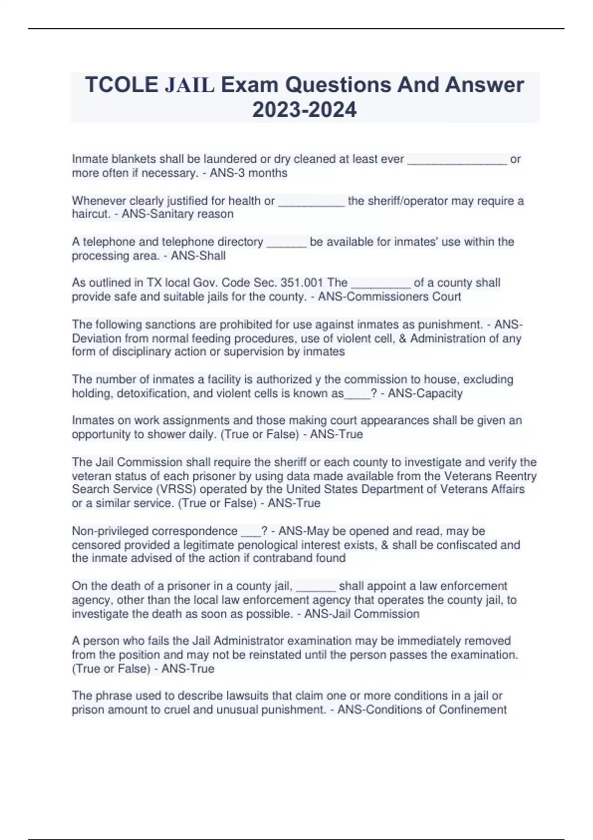 TCOLE JAIL Exam Questions And Answer Inmate blankets shall be laundered or dry cleaned at least ever _______________ or more often if necessary. - ANS-3 months Whenever clearly justified for health or __________ the sheriff/operator may require a haircut. - ANS-Sanitary reason A telephone and telephone directory ______ be available for inmates' use within the processing area. - ANS-Shall As outlined in TX local Gov. Code Sec. 351.001 The _________ of a county shall provide safe and suitable jails for the county. - ANS-Commissioners Court The following sanctions are prohibited for use against inmates as punishment. - ANSDeviation from normal feeding procedures, use of violent cell, & Administration of any form of disciplinary action or supervision by inmates The number of inmates a facility is authorized y the commission to house, excluding holding, detoxification, and violent cells is known as____? - ANS-Capacity Inmates on work assignments and those making court appearances shall be given an opportunity to shower daily. (True or False) - ANS-True The Jail Commission shall require the sheriff or each county to investigate and verify the veteran status of each prisoner by using data made available from the Veterans Reentry Search Service (VRSS) operated by the United States Department of Veterans Affairs or a similar service. (True or False) - ANS-True Non-privileged correspondence ___? - ANS-May be opened and read, may be censored provided a legitimate penological interest exists, & shall be confiscated and the inmate advised of the action if contraband found On the death of a prisoner in a county jail, ______ shall appoint a law enforcement agency, other than the local law enforcement agency that operates the county jail, to investigate the death as soon as possible. - ANS-Jail Commission A person who fails the Jail Administrator examination may be immediately removed from the position and may not be reinstated until the person passes the examination. (True or False) - ANS-True The phrase used to describe lawsuits that claim one or more conditions in a jail or prison amount to cruel and unusual punishment. - ANS-Conditions of Confinement CONTNUES...