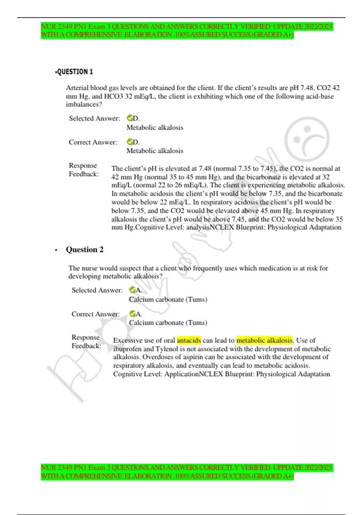 NUR 2349 PN1 Exam 3 QUESTIONS AND ANSWERS CORRECTLY VERIFIED UPPDATE 2022/2023 WITH A COMPREHENSIVE ELABORATION .100%ASSURED SUCCESS (GRADED A+) NUR 2349 PN1 Exam 3 QUESTIONS AND ANSWERS CORRECTLY VERIFIED UPPDATE 2022/2023 WITH A COMPREHENSIVE ELABORATION .100%ASSURED SUCCESS (GRADED A+) •QUESTION 1 Arterial blood gas levels are obtained for the client. If the client’s results are pH 7.48, CO2 42 mm Hg, and HCO3 32 mEq/L, the client is exhibiting which one of the following acid-base imbalances? Selected Answer: D. Metabolic alkalosis Correct Answer: D. Metabolic alkalosis Response Feedback: The client’s pH is elevated at 7.48 (normal 7.35 to 7.45), the CO2 is normal at 42 mm Hg (normal 35 to 45 mm Hg), and the bicarbonate is elevated at 32 mEq/L (normal 22 to 26 mEq/L). The client is experiencing metabolic alkalosis. In metabolic acidosis the client’s pH would be below 7.35, and the bicarbonate would be below 22 mEq/L. In respiratory acidosis the client’s pH would be below 7.35, and the CO2 would be elevated above 45 mm Hg. In respiratory alkalosis the client’s pH would be above 7.45, and the CO2 would be below 35 mm Hg.Cognitive Level: analysisNCLEX Blueprint: Physiological Adaptation • Question 2 The nurse would suspect that a client who frequently uses which medication is at risk for developing metabolic alkalosis? Selected Answer: A. Calcium carbonate (Tums) Correct Answer: A. Calcium carbonate (Tums) Response Feedback: Excessive use of oral antacids can lead to metabolic alkalosis. Use of ibuprofen and Tylenol is not associated with the development of metabolic alkalosis. Overdoses of aspirin can be associated with the development of respiratory alkalosis, and eventually can lead to metabolic acidosis. Cognitive Level: ApplicationNCLEX Blueprint: Physiological Adaptation