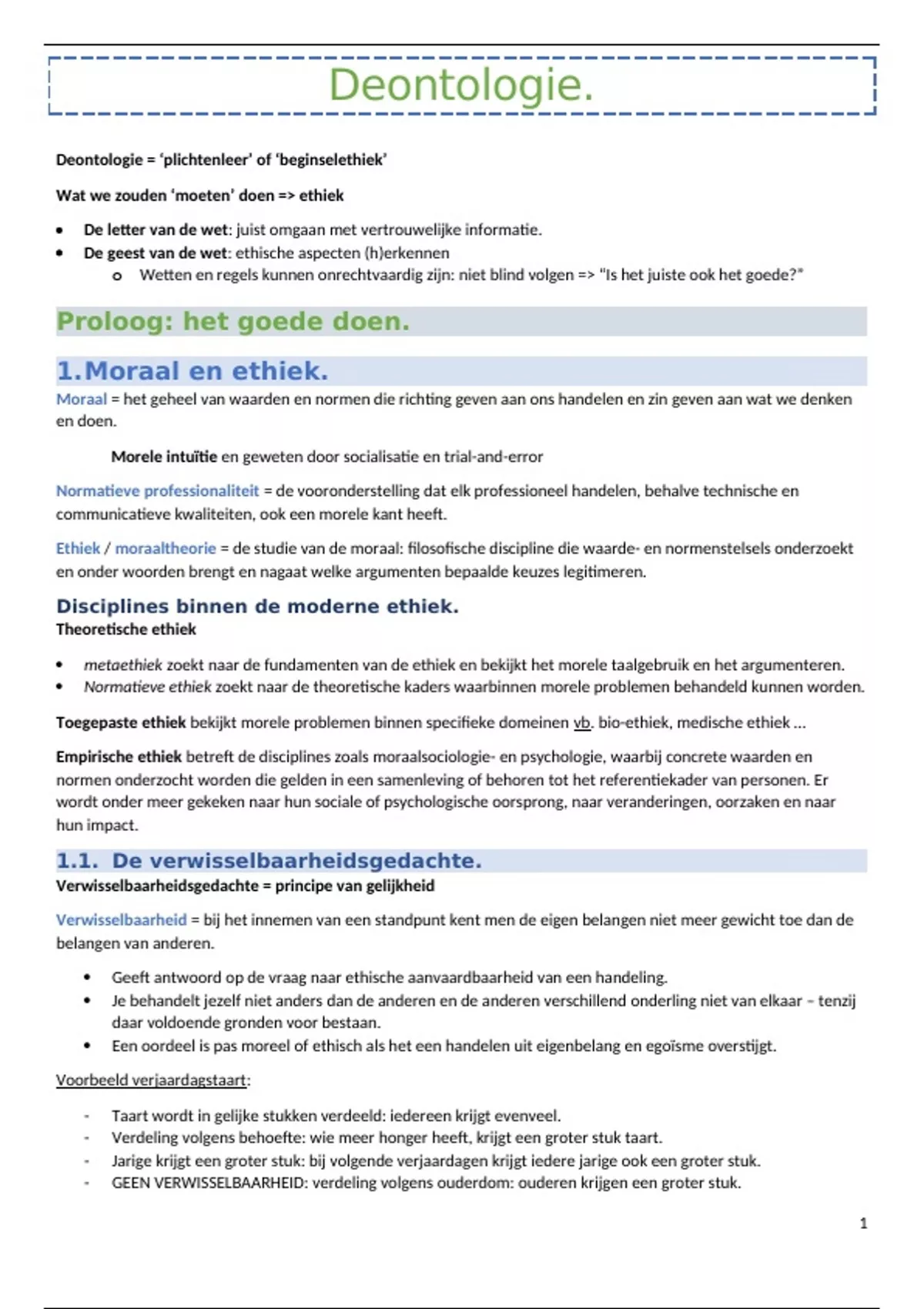 Samenvatting deontologie: notities les, informatie uit de powerpoint & informatie uit het boek.
