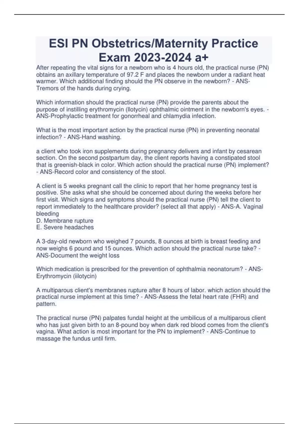 ESI PN Obstetrics/Maternity Practice Exam a+ After repeating the vital signs for a newborn who is 4 hours old, the practical nurse (PN) obtains an axillary temperature of 97.2 F and places the newborn under a radiant heat warmer. Which additional finding should the PN observe in the newborn? - ANSTremors of the hands during crying. Which information should the practical nurse (PN) provide the parents about the purpose of instilling erythromycin (llotycin) ophthalmic ointment in the newborn's eyes. - ANS-Prophylactic treatment for gonorrheal and chlamydia infection. What is the most important action by the practical nurse (PN) in preventing neonatal infection? - ANS-Hand washing. a client who took iron supplements during pregnancy delivers and infant by cesarean section. On the second postpartum day, the client reports having a constipated stool that is greenish-black in color. Which action should the practical nurse (PN) implement? - ANS-Record color and consistency of the stool. A client is 5 weeks pregnant call the clinic to report that her home pregnancy test is positive. She asks what she should be concerned about during the weeks before her first visit. Which signs and symptoms should the practical nurse (PN) tell the client to report immediately to the healthcare provider? (select all that apply) - ANS-A. Vaginal bleeding D. Membrane rupture E. Severe headaches A 3-day-old newborn who weighed 7 pounds, 8 ounces at birth is breast feeding and now weighs 6 pound and 15 ounces. Which action should the practical nurse take? - ANS-Document the weight loss Which medication is prescribed for the prevention of ophthalmia neonatorum? - ANSErythromycin (iilotycin) A multiparous client's membranes rupture after 8 hours of labor. which action should the practical nurse implement at this time? - ANS-Assess the fetal heart rate (FHR) and pattern. The practical nurse (PN) palpates fundal height at the umbilicus of a multiparous client who has just given birth to an 8-pound boy when dark red blood comes from the client's vagina. What action is most important for the PN to implement? - ANS-Continue to massage the fundus until firm. CONTINUES...