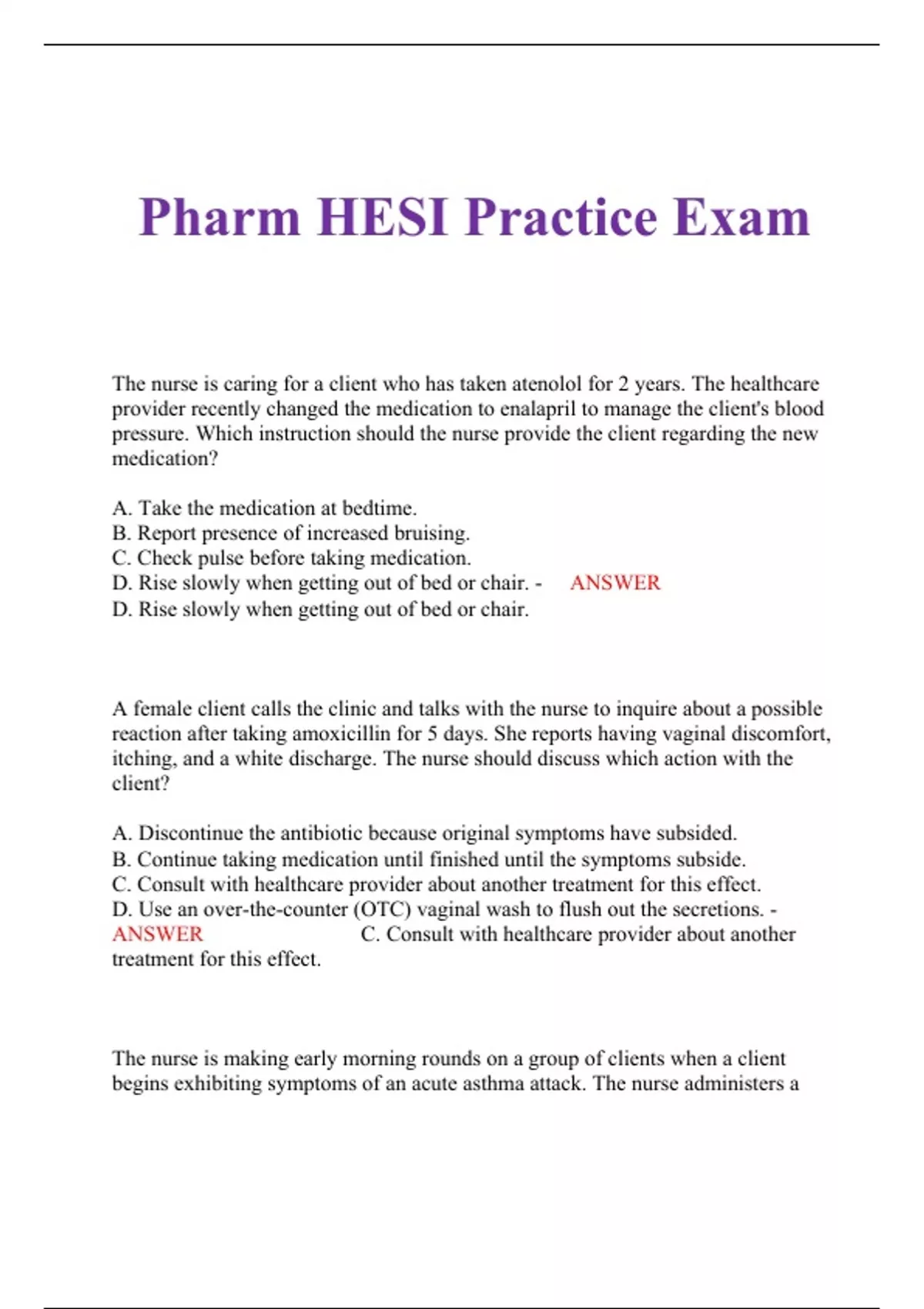 Pharm HESI Practice Exam The nurse is caring for a client who has taken atenolol for 2 years. The healthcare provider recently changed the medication to enalapril to manage the client's blood pressure. Which instruction should the nurse provide the client regarding the new medication? A. Take the medication at bedtime. B. Report presence of increased bruising. C. Check pulse before taking medication. D. Rise slowly when getting out of bed or chair. - ANSWER D. Rise slowly when getting out of bed or chair. A female client calls the clinic and talks with the nurse to inquire about a possible reaction after taking amoxicillin for 5 days. She reports having vaginal discomfort, itching, and a white discharge. The nurse should discuss which action with the client? A. Discontinue the antibiotic because original symptoms have subsided. B. Continue taking medication until finished until the symptoms subside. C. Consult with healthcare provider about another treatment for this effect. D. Use an over-the-counter (OTC) vaginal wash to flush out the secretions. - ANSWER C. Consult with healthcare provider about another treatment for this effect. The nurse is making early morning rounds on a group of clients when a client begins exhibiting symptoms of an acute asthma attack. The nurse administers a PRN prescription for a Beta 2 receptor agonist agent. Which client response should the nurse expect? A. Tachycardia. B. Increased blood pressure. C. Rapid resolution of wheezing. D. Improved pulse oximetry values. E. Reduce fever airway inflammation. - ANSWER C, D