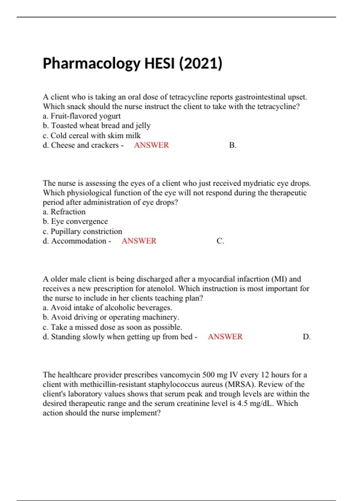 Pharmacology HESI (2021) A client who is taking an oral dose of tetracycline reports gastrointestinal upset. Which snack should the nurse instruct the client to take with the tetracycline? a. Fruit-flavored yogurt b. Toasted wheat bread and jelly c. Cold cereal with skim milk d. Cheese and crackers - ANSWER B. The nurse is assessing the eyes of a client who just received mydriatic eye drops. Which physiological function of the eye will not respond during the therapeutic period after administration of eye drops? a. Refraction b. Eye convergence c. Pupillary constriction d. Accommodation - ANSWER C. A older male client is being discharged after a myocardial infacrtion (MI) and receives a new prescription for atenolol. Which instruction is most important for the nurse to include in her clients teaching plan? a. Avoid intake of alcoholic beverages. b. Avoid driving or operating machinery. c. Take a missed dose as soon as possible. d. Standing slowly when getting up from bed - ANSWER D. The healthcare provider prescribes vancomycin 500 mg IV every 12 hours for a client with methicillin-resistant staphylococcus aureus (MRSA). Review of the client's laboratory values shows that serum peak and trough levels are within the desired therapeutic range and the serum creatinine level is 4.5 mg/dL. Which action should the nurse implement? a. Withhold the next scheduled dose and contact the healthcare provider. b. Monitor the laboratory values until all prescribed doses have been given. c. Administer the next dose and flag the results for the healthcare provider. d. Insert a second IV catheter for the administration of emergency IV fluids. - ANSWER A. After taking orlistat for one week, a female client tells the home health nurse that she is experiencing increasingly frequent oily stools and flatus. Which action should the nurse take? a. Instruct the client to increase her intake of saturated fats over the next week. b. Obtain a stool specimen to evaluate for occult blood and fat content. c. Ask the client to describe her dietary intake history for the last several days. d. Advise the client to stop taking the drug and contact her healthcare provider. - ANSWER C.
