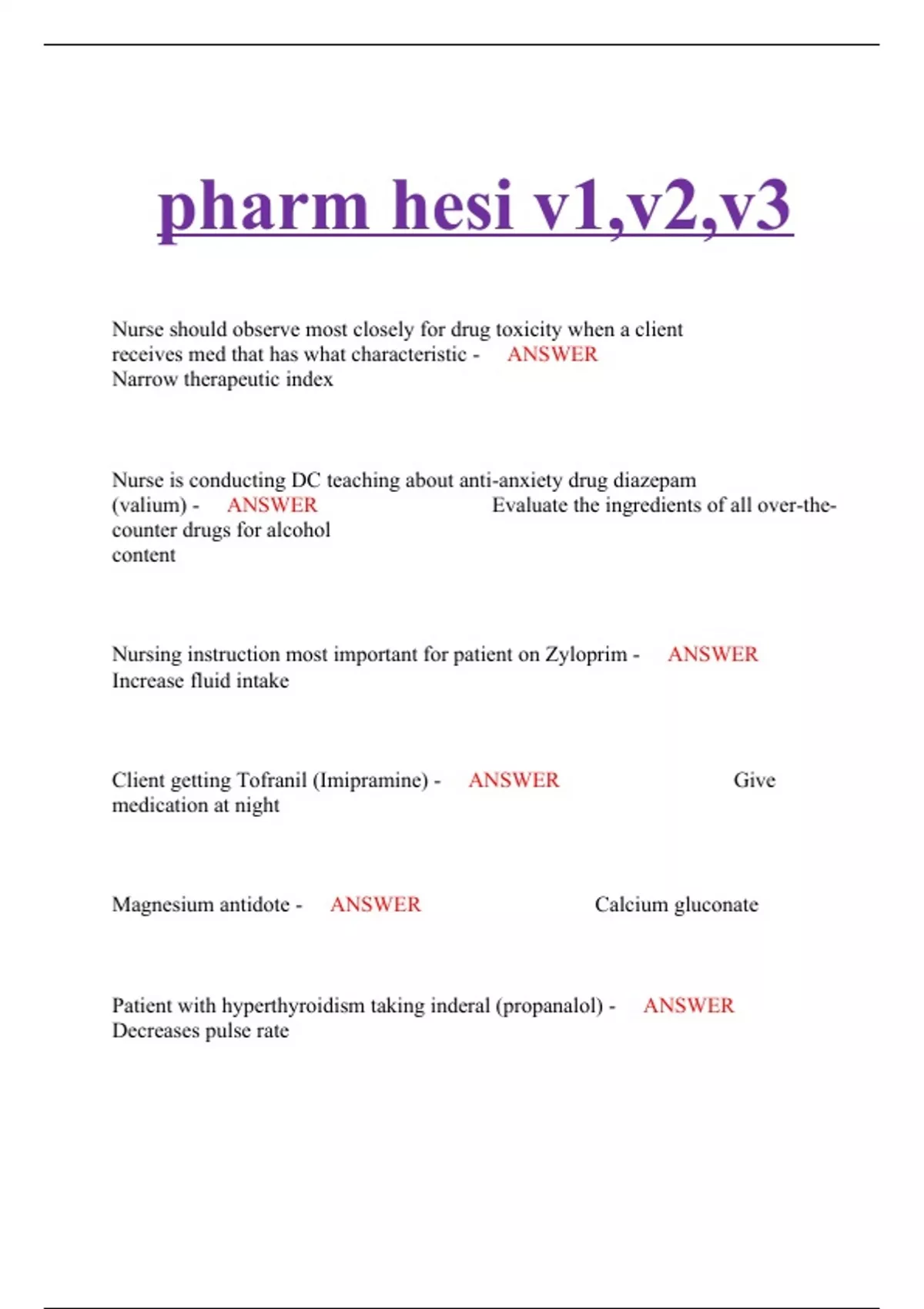 pharm hesi v1,v2,v3 Nurse should observe most closely for drug toxicity when a client receives med that has what characteristic - ANSWER Narrow therapeutic index Nurse is conducting DC teaching about anti-anxiety drug diazepam (valium) - ANSWER Evaluate the ingredients of all over-the-counter drugs for alcohol content Nursing instruction most important for patient on Zyloprim - ANSWER Increase fluid intake Client getting Tofranil (Imipramine) - ANSWER Give medication at night Magnesium antidote - ANSWER Calcium gluconate Patient with hyperthyroidism taking inderal (propanalol) - ANSWER Decreases pulse rate Medication dosing-heparin 25000 units at 7ml/hr doctor changed rate to 900 units what is the - ANSWER Mls/hr Med was ordered 100mg in 4 divided doses in 24 hours available in 25mg, how many will you give every 6 hours - ANSWER 1 pill Q6H
