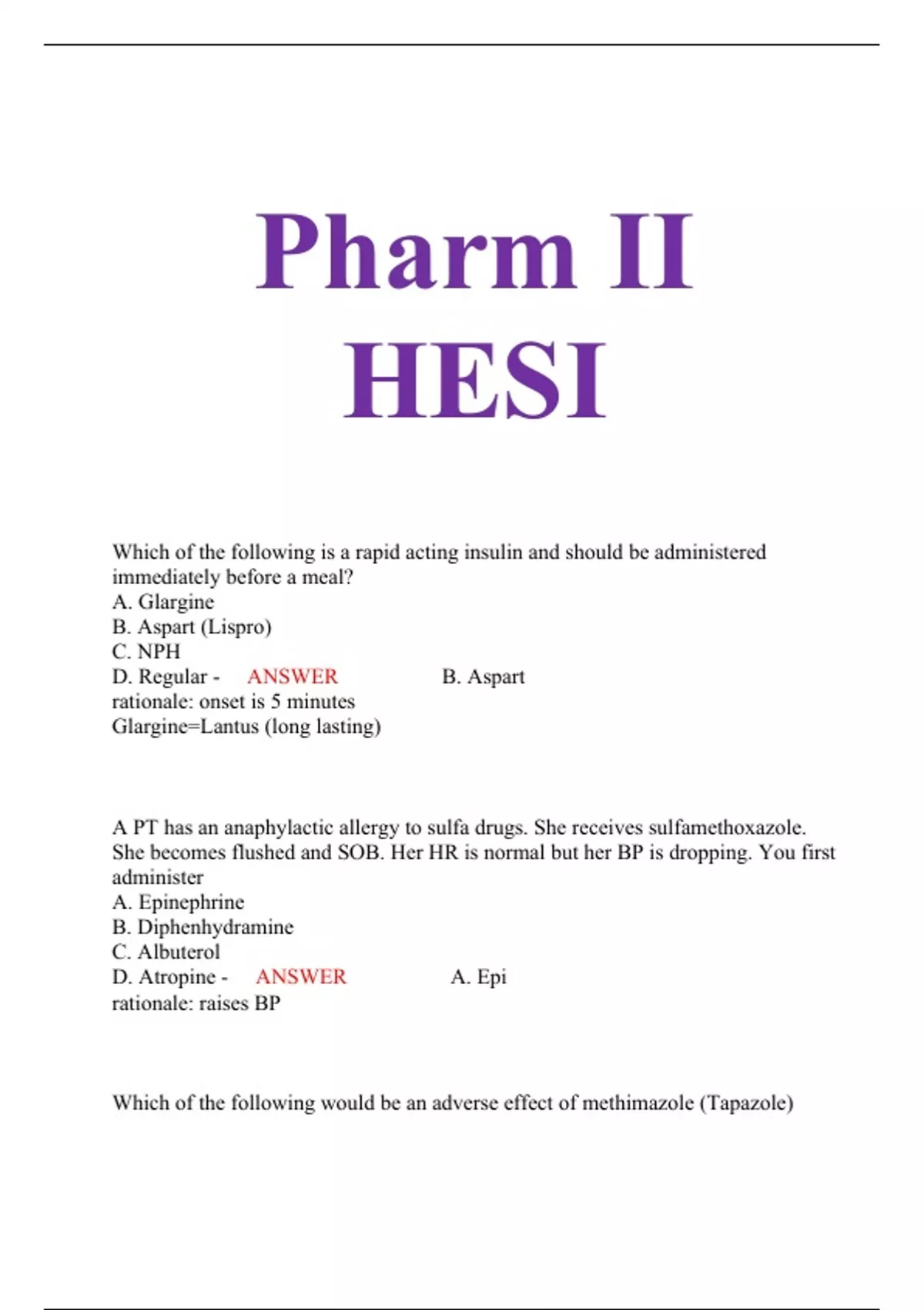 Pharm II HESI Which of the following is a rapid acting insulin and should be administered immediately before a meal? A. Glargine B. Aspart (Lispro) C. NPH D. Regular - ANSWER B. Aspart rationale: onset is 5 minutes Glargine=Lantus (long lasting) A PT has an anaphylactic allergy to sulfa drugs. She receives sulfamethoxazole. She becomes flushed and SOB. Her HR is normal but her BP is dropping. You first administer A. Epinephrine B. Diphenhydramine C. Albuterol D. Atropine - ANSWER A. Epi rationale: raises BP Which of the following would be an adverse effect of methimazole (Tapazole) A. Tachycardia B. Bradycardia C. SOB D. Arrhythmias - ANSWER This is an anti-thyroid medication B. Bradycardia One of your PTs is started on verapamil (Calan). Before administering the dose you check A. HR B. urine output C. weight D. temp - ANSWER this is a calcium channel blocker--worried about HR A. HR
