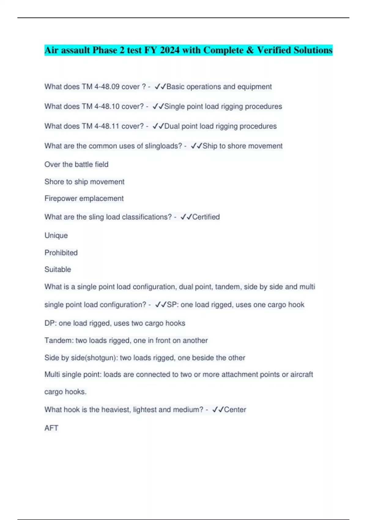 Air assault Phase 2 test FY 2024 with Complete & Verified Solutions What does TM 4-48.09 cover ? -️️ Basic operations and equipment What does TM 4-48.10 cover? -️️ Single point load rigging procedures What does TM 4-48.11 cover? -️️ Dual point load rigging procedures What are the common uses of slingloads? -️️ Ship to shore movement Over the battle field Shore to ship movement Firepower emplacement What are the sling load classifications? -️️ Certified Unique Prohibited Suitable What is a single point load configuration, dual point, tandem, side by side and multi single point load configuration? -️️ SP: one load rigged, uses one cargo hook DP: one load rigged, uses two cargo hooks Tandem: two loads rigged, one in front on another Side by side(shotgun): two loads rigged, one beside the other Multi single point: loads are connected to two or more attachment points or aircraft cargo hooks. What hook is the heaviest, lightest and medium? -️️ Center AFT