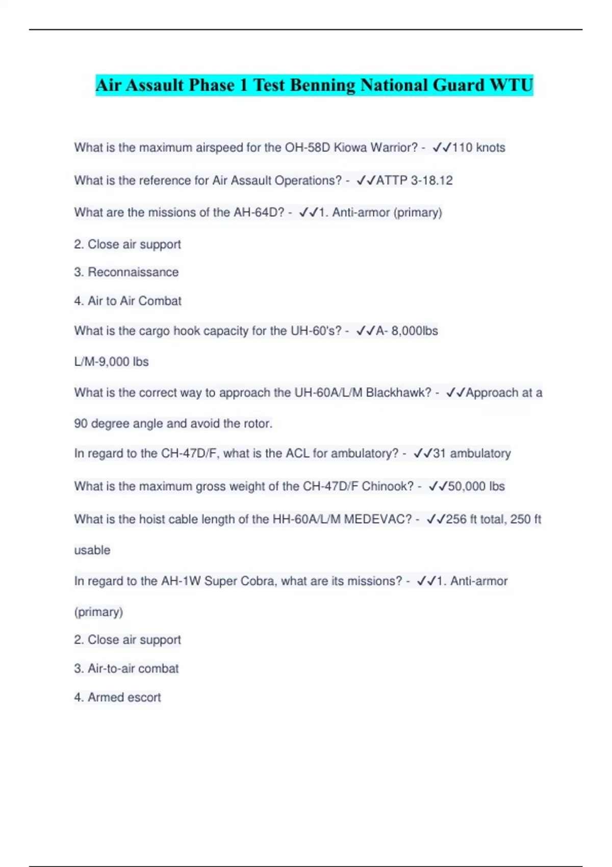 Air Assault Phase 1 Test Benning National Guard WTU What is the maximum airspeed for the OH-58D Kiowa Warrior? -️️ 110 knots What is the reference for Air Assault Operations? -️️ ATTP 3-18.12 What are the missions of the AH-64D? -️️ 1. Anti-armor (primary) 2. Close air support 3. Reconnaissance 4. Air to Air Combat What is the cargo hook capacity for the UH-60's? -️️ A- 8,000lbs L/M-9,000 lbs What is the correct way to approach the UH-60A/L/M Blackhawk? -️️ Approach at a 90 degree angle and avoid the rotor. In regard to the CH-47D/F, what is the ACL for ambulatory? -️️ 31 ambulatory What is the maximum gross weight of the CH-47D/F Chinook? -️️ 50,000 lbs What is the hoist cable length of the HH-60A/L/M MEDEVAC? -️️ 256 ft total, 250 ft usable In regard to the AH-1W Super Cobra, what are its missions? -️️ 1. Anti-armor (primary) 2. Close air support 3. Air-to-air combat 4. Armed escort
