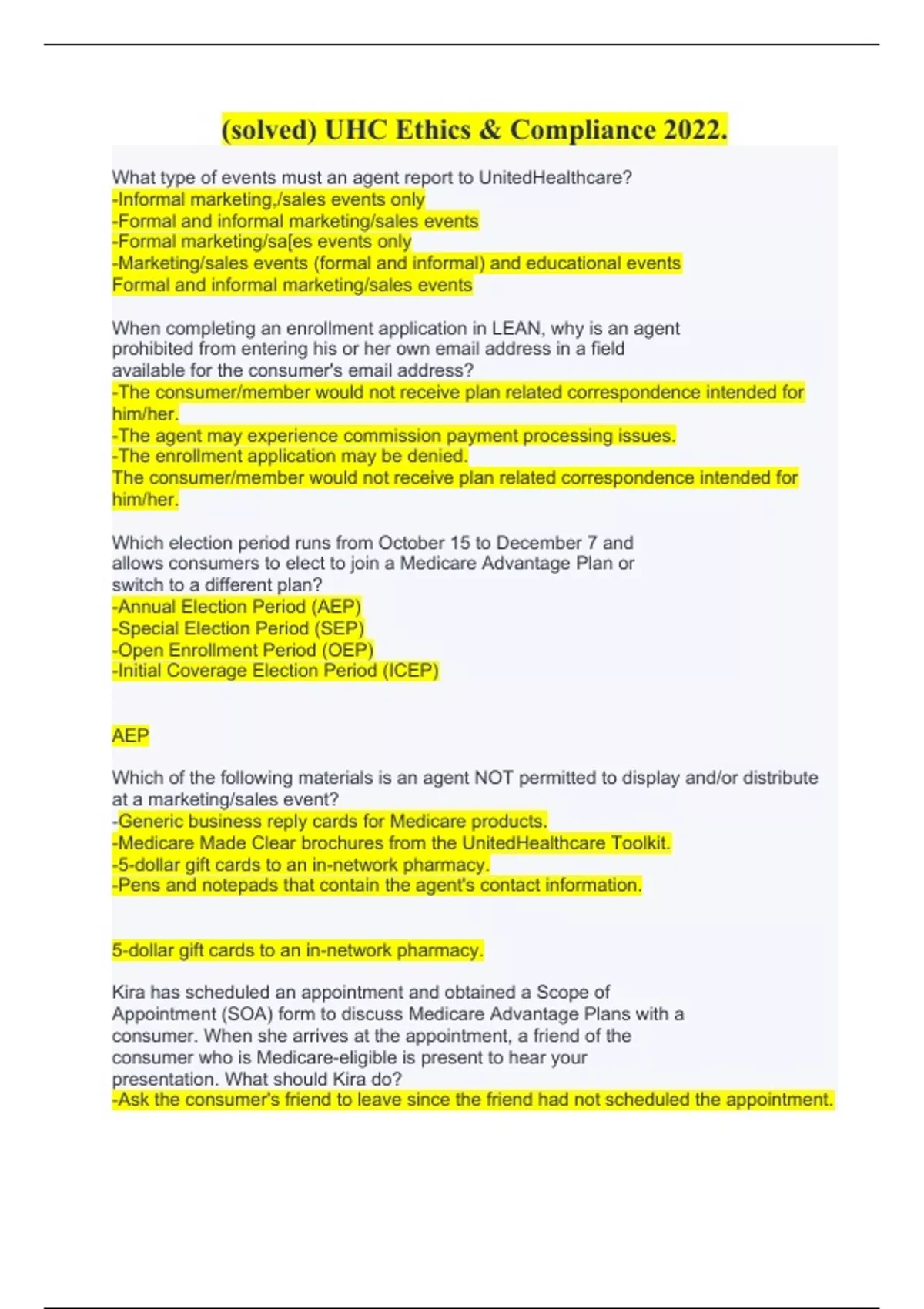 (solved) UHC Ethics & Compliance 2022. What type of events must an agent report to UnitedHealthcare? -Informal marketing,/sales events only -Formal and informal marketing/sales events -Formal marketing/sa[es events only -Marketing/sales events (formal and informal) and educational events Formal and informal marketing/sales events When completing an enrollment application in LEAN, why is an agent prohibited from entering his or her own email address in a field available for the consumer's email address? -The consumer/member would not receive plan related correspondence intended for him/her. -The agent may experience commission payment processing issues. -The enrollment application may be denied. The consumer/member would not receive plan related correspondence intended for him/her. Which election period runs from October 15 to December 7 and allows consumers to elect to join a Medicare Advantage Plan or switch to a different plan? -Annual Election Period (AEP) -Special Election Period (SEP) -Open Enrollment Period (OEP) -Initial Coverage Election Period (ICEP)