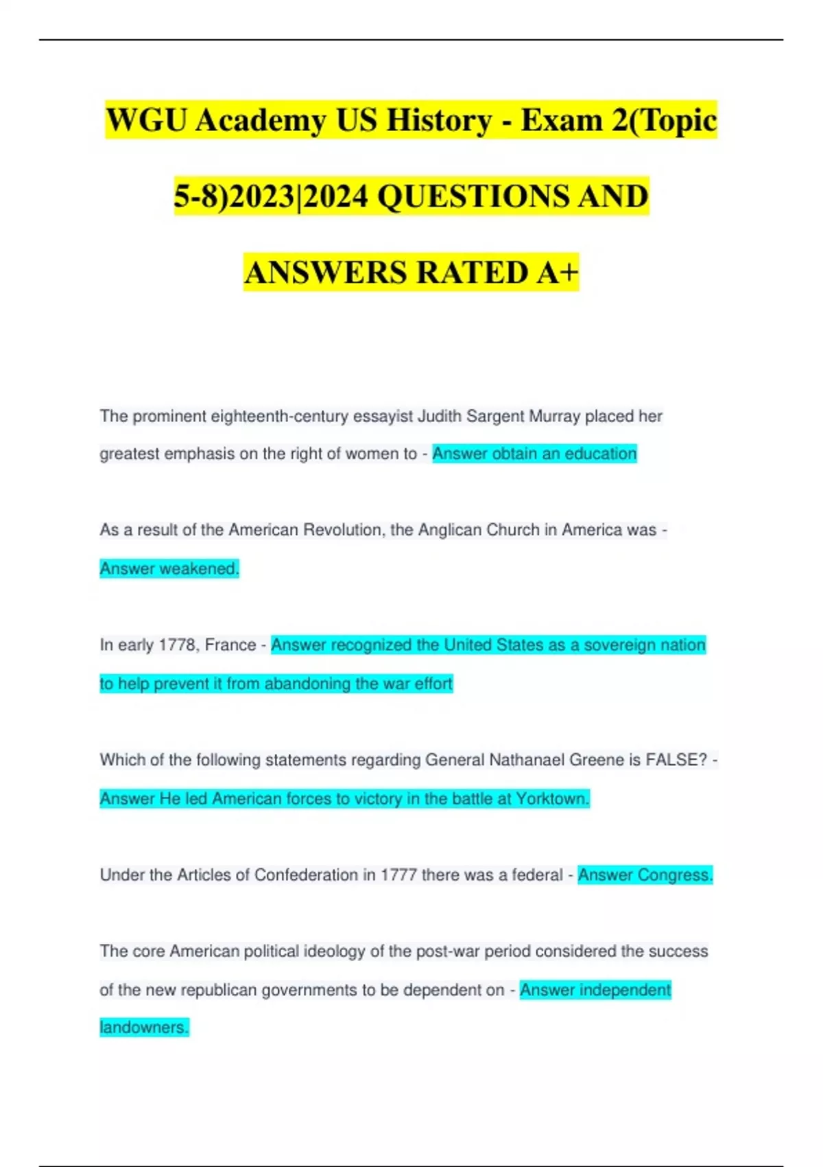WGU Academy US History - Exam 2(Topic 5-8)2023|2024 QUESTIONS AND ANSWERS RATED A+ The prominent eighteenth-century essayist Judith Sargent Murray placed her greatest emphasis on the right of women to - Answer obtain an education As a result of the American Revolution, the Anglican Church in America was - Answer weakened. In early 1778, France - Answer recognized the United States as a sovereign nation to help prevent it from abandoning the war effort Which of the following statements regarding General Nathanael Greene is FALSE? - Answer He led American forces to victory in the battle at Yorktown. Under the Articles of Confederation in 1777 there was a federal - Answer Congress. The core American political ideology of the post-war period considered the success of the new republican governments to be dependent on - Answer independent landowners.
