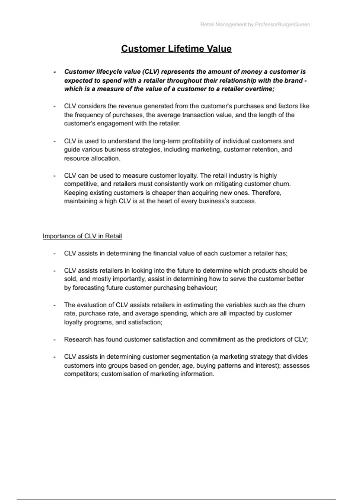 Marketing IIB (Retail Management) Chpt.7 - Customer Lifetime Value