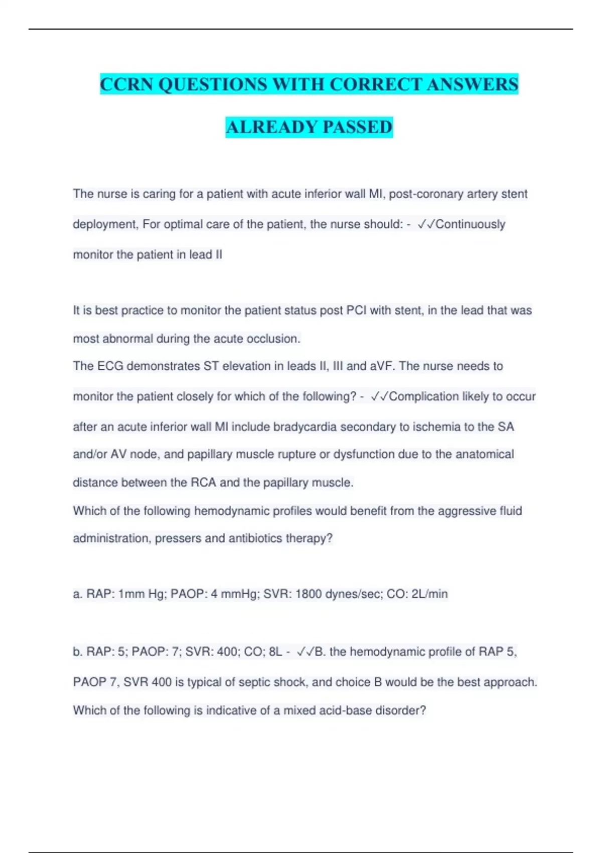 CCRN QUESTIONS WITH CORRECT ANSWERS ALREADY PASSED The nurse is caring for a patient with acute inferior wall MI, post-coronary artery stent deployment, For optimal care of the patient, the nurse should: - Continuously monitor the patient in lead II It is best practice to monitor the patient status post PCI with stent, in the lead that was most abnormal during the acute occlusion. The ECG demonstrates ST elevation in leads II, III and aVF. The nurse needs to monitor the patient closely for which of the following? - Complication likely to occur after an acute inferior wall MI include bradycardia secondary to ischemia to the SA and/or AV node, and papillary muscle rupture or dysfunction due to the anatomical distance between the RCA and the papillary muscle. Which of the following hemodynamic profiles would benefit from the aggressive fluid administration, pressers and antibiotics therapy? a. RAP: 1mm Hg; PAOP: 4 mmHg; SVR: 1800 dynes/sec; CO: 2L/min b. RAP: 5; PAOP: 7; SVR: 400; CO; 8L - B. the hemodynamic profile of RAP 5, PAOP 7, SVR 400 is typical of septic shock, and choice B would be the best approach. Which of the following is indicative of a mixed acid-base disorder