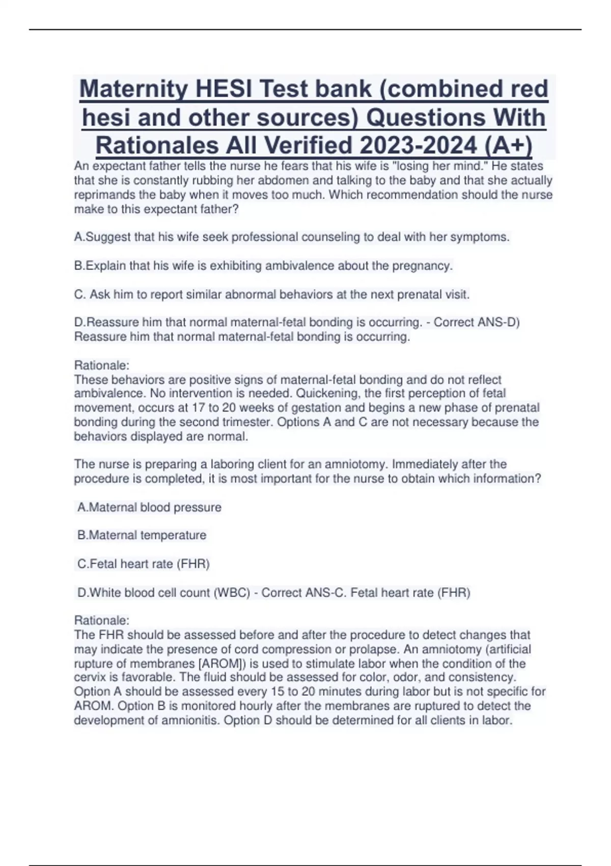 Maternity HESI Test bank (combined red hesi and other sources) Questions With Rationales All Verified (A+) An expectant father tells the nurse he fears that his wife is "losing her mind." He states that she is constantly rubbing her abdomen and talking to the baby and that she actually reprimands the baby when it moves too much. Which recommendation should the nurse make to this expectant father? A.Suggest that his wife seek professional counseling to deal with her symptoms. B.Explain that his wife is exhibiting ambivalence about the pregnancy. C. Ask him to report similar abnormal behaviors at the next prenatal visit. D.Reassure him that normal maternal-fetal bonding is occurring. - Correct ANS-D) Reassure him that normal maternal-fetal bonding is occurring. Rationale: These behaviors are positive signs of maternal-fetal bonding and do not reflect ambivalence. No intervention is needed. Quickening, the first perception of fetal movement, occurs at 17 to 20 weeks of gestation and begins a new phase of prenatal bonding during the second trimester. Options A and C are not necessary because the behaviors displayed are normal. The nurse is preparing a laboring client for an amniotomy. Immediately after the procedure is completed, it is most important for the nurse to obtain which information? A.Maternal blood pressure B.Maternal temperature C.Fetal heart rate (FHR) D.White blood cell count (WBC) - Correct ANS-C. Fetal heart rate (FHR) Rationale: The FHR should be assessed before and after the procedure to detect changes that may indicate the presence of cord compression or prolapse. An amniotomy (artificial rupture of membranes [AROM]) is used to stimulate labor when the condition of the cervix is favorable. The fluid should be assessed for color, odor, and consistency. Option A should be assessed every 15 to 20 minutes during labor but is not specific for AROM. Option B is monitored hourly after the membranes are ruptured to detect the development of amnionitis. Option D should be determined for all clients in labor. A nurse receives a shift change report for a newborn who is 12 hours post-vaginal delivery. In developing a plan of care, the nurse should give the highest priority to which finding? A.Cyanosis of the hands and feet B.Skin color that is slightly jaundiced C.Tiny white papules on the nose or chin D.Red patches on the cheeks and trunk - Correct ANS-B. Skin color that is slightly jaundiced Rationale: Jaundice, a yellow skin coloration, is caused by elevated levels of bilirubin, which should be further evaluated in a newborn 24 hours old. Acrocyanosis (blue color of the hands and feet) is a common finding in newborns; it occurs because the capillary system is immature. Milia are small white papules present on the nose and chin that are caused by sebaceous gland blockage and disappear in a few weeks. Small red patches on the cheeks and trunk are called erythema toxicum neonatorum, a common finding in newborns. A breastfeeding postpartum client is diagnosed with mastitis, and antibiotic therapy is prescribed. Which instruction should the nurse provide to this client? A.Breastfeed the infant, ensuring that both breasts are completely emptied. B.Feed expressed breast milk to avoid the pain of the infant latching onto the infected breast. C.Breastfeed on the unaffected breast only until the mastitis subsides. D.Dilute expressed breast milk with sterile water to reduce the antibiotic effect on the infant. - Correct ANS-A.Breastfeed the infant, ensuring that both breasts are completely emptied. Rationale:Mastitis, caused by plugged milk ducts, is related to breast engorgement, and breastfeeding during mastitis facilitates the complete emptying of engorged breasts, eliminating the pressure on the inflamed breast tissue. Option B is less painful but does not facilitate complete emptying of the breast tissue. Option C will not relieve the engorgement on the affected side. Option D will not decrease antibiotic effects on the infant. A 38-week primigravida who works as a secretary and sits at a computer 8 hours each day tells the nurse that her feet have begun to swell. Which instruction will aid in the prevention of pooling of blood in the lower extremities? A.Wear support stockings. B.Reduce salt in the diet. C.Move about every hour. D.Avoid constrictive clothing. - Correct ANS-C.Move about every hour. Rationale: Pooling of blood in the lower extremities results from the enlarged uterus exerting pressure on the pelvic veins. Moving about every hour will relieve pressure on the pelvic veins and increase venous return. Option A would increase venous return from varicose veins in the lower extremities but would be of little help with swelling. Option B might be helpful with generalized edema but is not specific for edematous lower extremities. Option D does not address venous return, and there is no indication in the question that constrictive clothing is a problem. Twenty-four hours after admission to the newborn nursery, a full-term male infant develops localized swelling on the right side of his head. In a newborn, what is the most likely cause of this accumulation of blood between the periosteum and skull that does not cross the suture line? A.Cephalhematoma, which is caused by forceps trauma B.Subarachnoid hematoma, which requires immediate drainage C.Molding, which is caused by pressure during labor D.Subdural hematoma, which can result in lifelong damage - Correct ANSA.Cephalhematoma, which is caused by forceps trauma Rationale: Cephalhematoma, a slight abnormal variation of the newborn, usually arises within the first 24 hours after delivery. Trauma from delivery causes capillary bleeding between the periosteum and skull. Option C is a cranial distortion lasting 5 to 7 days, caused by pressure on the cranium during vaginal delivery, and is a common variation of the newborn. Options B and D both involve intracranial bleeding and could not be detected by physical assessment alone. Prior t