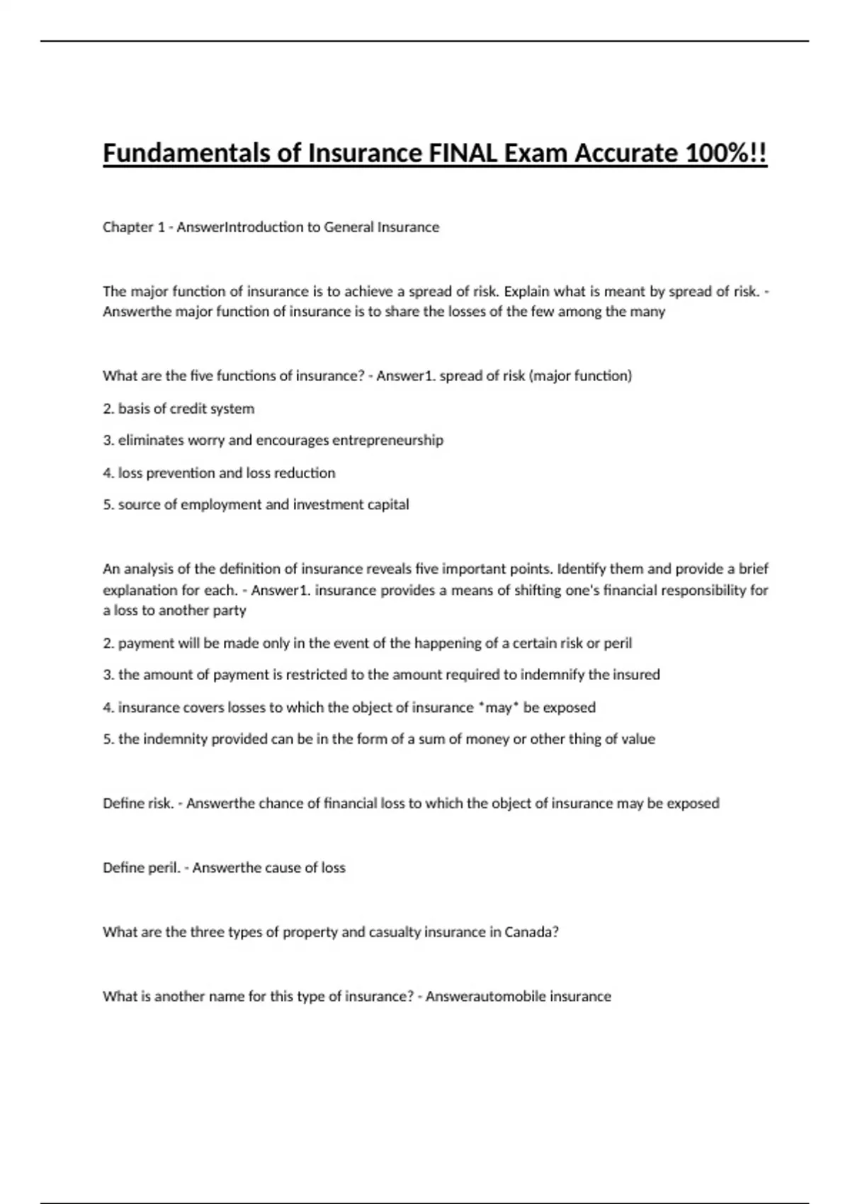 Fundamentals of Insurance FINAL Exam Accurate 100%!! Chapter 1 - AnswerIntroduction to General Insurance The major function of insurance is to achieve a spread of risk. Explain what is meant by spread of risk. - Answerthe major function of insurance is to share the losses of the few among the many What are the five functions of insurance? - Answer1. spread of risk (major function) 2. basis of credit system 3. eliminates worry and encourages entrepreneurship 4. loss prevention and loss reduction 5. source of employment and investment capital An analysis of the definition of insurance reveals five important points. Identify them and provide a brief explanation for each. - Answer1. insurance provides a means of shifting one's financial responsibility for a loss to another party 2. payment will be made only in the event of the happening of a certain risk or peril 3. the amount of payment is restricted to the amount required to indemnify the insured 4. insurance covers losses to which the object of insurance *may* be exposed 5.
