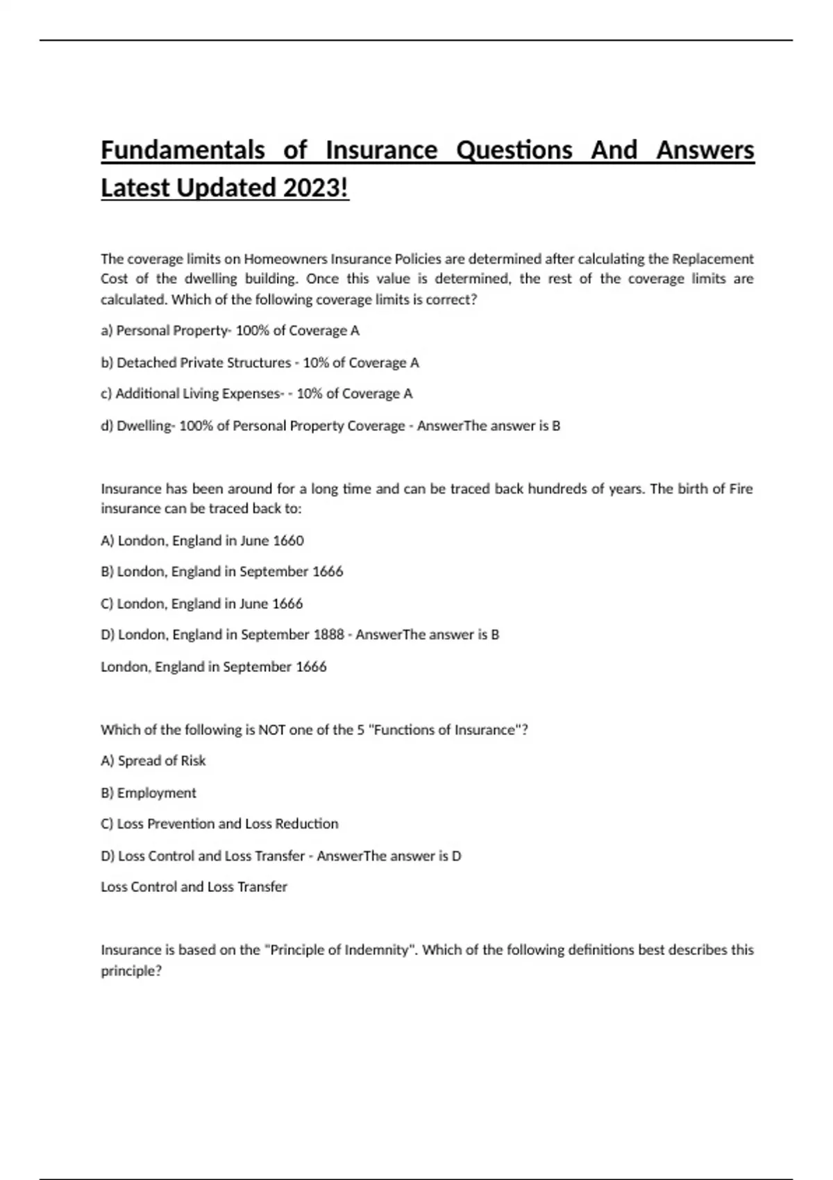 Fundamentals of Insurance Questions And Answers Latest Updated 2023! The coverage limits on Homeowners Insurance Policies are determined after calculating the Replacement Cost of the dwelling building. Once this value is determined, the rest of the coverage limits are calculated. Which of the following coverage limits is correct? a) Personal Property- 100% of Coverage A b) Detached Private Structures - 10% of Coverage A c) Additional Living Expenses- - 10% of Coverage A d) Dwelling- 100% of Personal Property Coverage - AnswerThe answer is B Insurance has been around for a long time and can be traced back hundreds of years. The birth of Fire insurance can be traced back to: A) London, England in June 1660 B) London, England in September 1666 C) London, England in June 1666 D) London, England in September 1888 - AnswerThe answer is B London, England in September 1666 Which of the following is NOT one of the 5 "Functions of Insurance"? A) Spread of Risk B) Employment C) Loss Prevention and Loss Reduction D) Loss Control and Loss Transfer - AnswerThe answer is D Loss Control and Loss Transfer Insurance is based on the "Principle of Indemnity". Which of the following definitions best describes this