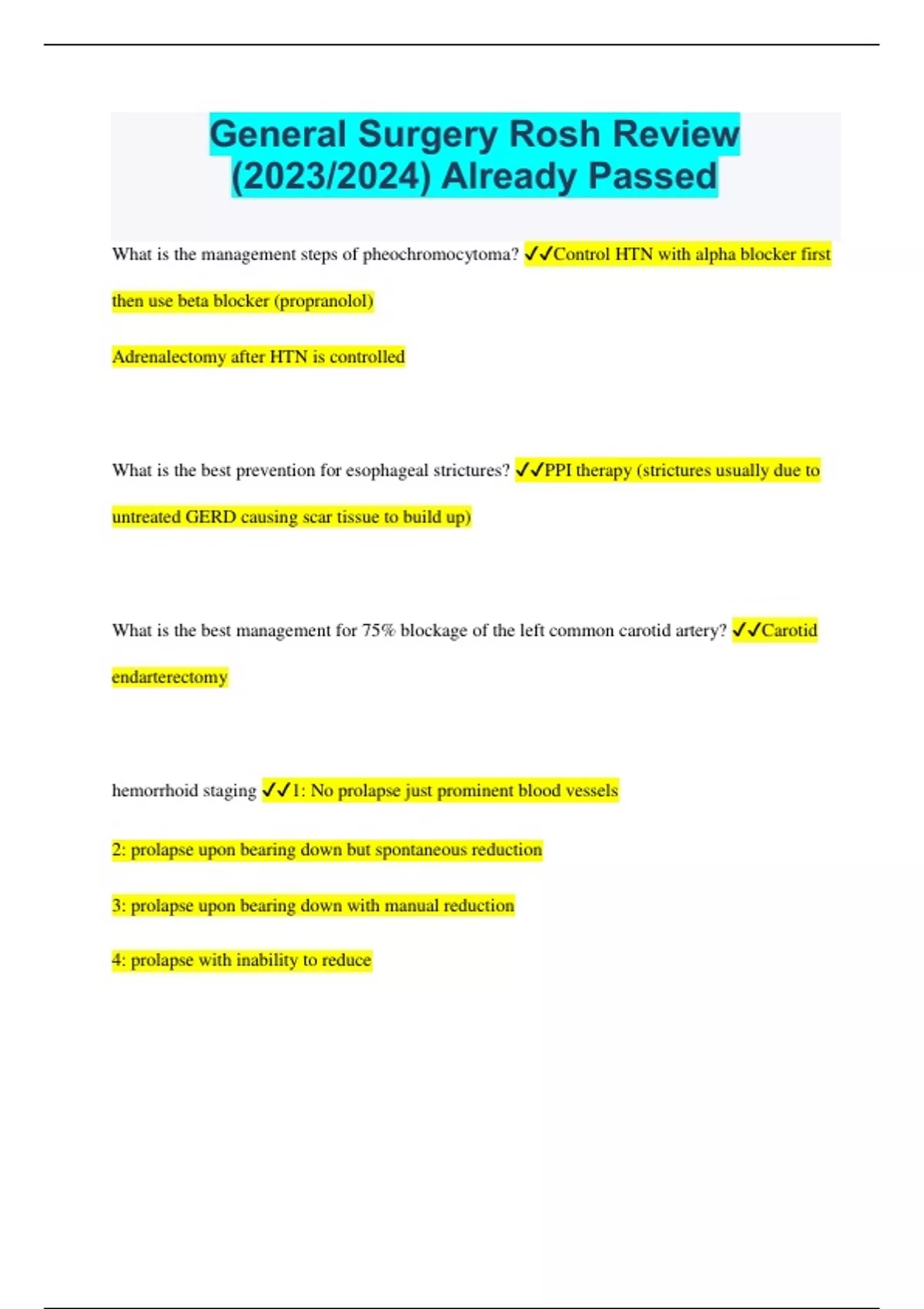 General Surgery Rosh Review (2023/2024) Already Passed What is the management steps of pheochromocytoma? Control HTN with alpha blocker first then use beta blocker (propranolol) Adrenalectomy after HTN is controlled What is the best prevention for esophageal strictures? PPI therapy (strictures usually due to untreated GERD causing scar tissue to build up) What is the best management for 75% blockage of the left common carotid artery? Carotid endarterectomy hemorrhoid staging 1: No prolapse just prominent blood vessels 2: prolapse upon bearing down but spontaneous reduction 3: prolapse upon bearing down with manual reduction 4: prolapse with inability to reduce What is the biggest lifetime management for post-roux-en-y gastric bypass surgery? Micronutrient supplementation What is it called with an incision site with small amount of purulent drainage, no dehiscence, and no fluctuance? Cellulitis (abscesses will have fluctuance) What is the test to confirm diagnosis of 20yo with who is 6 foot 160lbs. chest pain and dyspnea that occurred while playing basketball? Chest Xray (look for signs of spontaneous pneumothorax- common in skinny, tall males) Which of the following is a physical exam finding characterized by pain and inspiratory arrest during palpation of the right upper quadrant? Murphy's Sign (gallbladder inflammation) A woman is being seen for pre-op evaluation. A chest radiograph reveals bilateral hilar adenopathy with symmetric enlargement of the hila. Serum angiotensin-converting enzyme levels are ordered and found to be elevated. Which of the following is the most likely diagnosis? Sarcoidosis (common in AA women, bl hilar adenopathy, elevated serum ace) Patient has uncontrolled GERD and worsening dysphagia. What is best initial test? Upper endoscopy A 53-year-old overweight man presents to the outpatient clinic with recurrent burning abdominal pain that occurs two to three hours after a meal. Which of the following would be the most frequent physical examination finding in this patient? Epigastric tenderness Patient with necrotizing pancreatitis, what will you most likely discover in patient's H&P? Ecchymosis of the flanks (Grey-Turners' sign) What is test of choice to evaluate DVT? venous doppler US What is a likely cause of a respiratory acidosis on a pt in an ICU who is intubated? Hypoventilation (retaining too much CO2) What is it called when a person has pain in their legs when exercising and it resolves at rest? claudication What is the most common vision change with a pituitary tumor? dec temporal vision Patient presents with vague epigastric pain with weight loss. What is most likely diagnosis? Pancreatic cancer (Courvoisier sign-palpable, non-tender gallbladder with jaundice) What is best route of administration for iron in a patient who is post-roux-en-y gastric bypass surgery? IV (not oral because worried about absorption rate