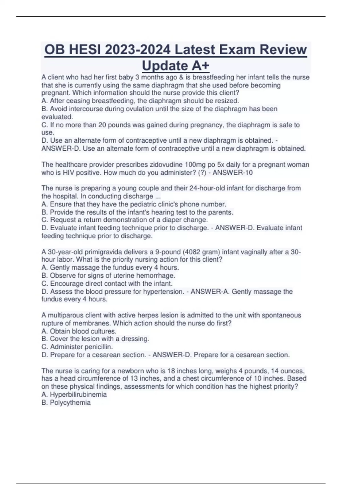 OB HESI Latest Exam Review Update A+ A client who had her first baby 3 months ago & is breastfeeding her infant tells the nurse that she is currently using the same diaphragm that she used before becoming pregnant. Which information should the nurse provide this client? A. After ceasing breastfeeding, the diaphragm should be resized. B. Avoid intercourse during ovulation until the size of the diaphragm has been evaluated. C. If no more than 20 pounds was gained during pregnancy, the diaphragm is safe to use. D. Use an alternate form of contraceptive until a new diaphragm is obtained. - ANSWER-D. Use an alternate form of contraceptive until a new diaphragm is obtained. The healthcare provider prescribes zidovudine 100mg po 5x daily for a pregnant woman who is HIV positive. How much do you administer? (?) - ANSWER-10 The nurse is preparing a young couple and their 24-hour-old infant for discharge from the hospital. In conducting discharge ... A. Ensure that they have the pediatric clinic's phone number. B. Provide the results of the infant's hearing test to the parents. C. Request a return demonstration of a diaper change. D. Evaluate infant feeding technique prior to discharge. - ANSWER-D. Evaluate infant feeding technique prior to discharge. A 30-year-old primigravida delivers a 9-pound (4082 gram) infant vaginally after a 30- hour labor. What is the priority nursing action for this client? A. Gently massage the fundus every 4 hours. B. Observe for signs of uterine hemorrhage. C. Encourage direct contact with the infant. D. Assess the blood pressure for hypertension. - ANSWER-A. Gently massage the fundus every 4 hours. A multiparous client with active herpes lesion is admitted to the unit with spontaneous rupture of membranes. Which action should the nurse do first? A. Obtain blood cultures. B. Cover the lesion with a dressing. C. Administer penicillin. D. Prepare for a cesarean section. - ANSWER-D. Prepare for a cesarean section. The nurse is caring for a newborn who is 18 inches long, weighs 4 pounds, 14 ounces, has a head circumference of 13 inches, and a chest circumference of 10 inches. Based on these physical findings, assessments for which condition has the highest priority? A. Hyperbilirubinemia B. Polycythemia C. Hyperthermia D. Hypoglycemia - ANSWER-D. Hypoglycemia While assessing a 40-week gestation primigravida in active labor, the client's membranes rupture spontaneously and the nurse notices that the amniotic fluid is meconium stained. Which additional finding is most important for the nurse to report to the healthcare provider? A. Maternal blood pressure of 130/85 mmHg. B. Fetal heart rate of 100 to 110 bpm. C. Vaginal exam reveals a cervix 6cm dilated. D. Contractions occurring every 2-3 minutes. - ANSWER-A. Maternal blood pressure of 130/85 mmHg. The nurse is caring for a 35-week gestation infant delivered by cesarean section 2 hours ago. The nurse observes the infant's respiratory rate is 72 breaths/minute with nasal flaring, grunting, and retractions. The nurse should recognize these findings indicate which complication? A. Persistent pulmonary hypertension of the newborn. B. Transient tachypnea of the newborn. C. Meconium aspiration syndrome. D. Bronchopulmonary dysplasia. - ANSWER-B. Transient tachypnea of the newborn. A primipara client at 42 weeks gestation is admitted for induction. Within one hour after initiating an oxytocin infusion, her cervix is 100% effaced and 6 cm dilated, contractions are occurring every 1 minute with a 75 second duration. The nurse stops the oxytocin and starts oxygen. After 30 minutes of uterine rest, the contractions are occurring every 5 minutes with 20 second duration. What intervention should the nurse implement? A. Notify nursery about the client's response. B. Check for clonus in both feet. C. Stop oxygen per cannula. D. Restart oxytocin infusion rate per protocol. - ANSWER-D. Restart oxytocin infusion rate per protocol. At 0600 while admitting a woman for a scheduled repeat cesarean section, the client tells the nurse that she drank a cup of coffee at 0400 because she wanted to avoid getting a headache. What action would the nurse take first? A. Ensure preoperative lab results are available. B. Inform the anesthesia care provider. C. Start prescribed IV with Lactated Ringer's. D. Contact the client's obstetrician. - ANSWER-B. Inform the anesthesia care provider. The nurse is caring for a postpartum client who is exhibiting symptoms of a spinal headache 24 hours following delivery of a normal newborn. Prior to the anesthesiologists arrival on the unit, which action should the nurse perform? A. Cleanse the spinal injection site. B. Place procedure equipment at bedside CONTINUES....