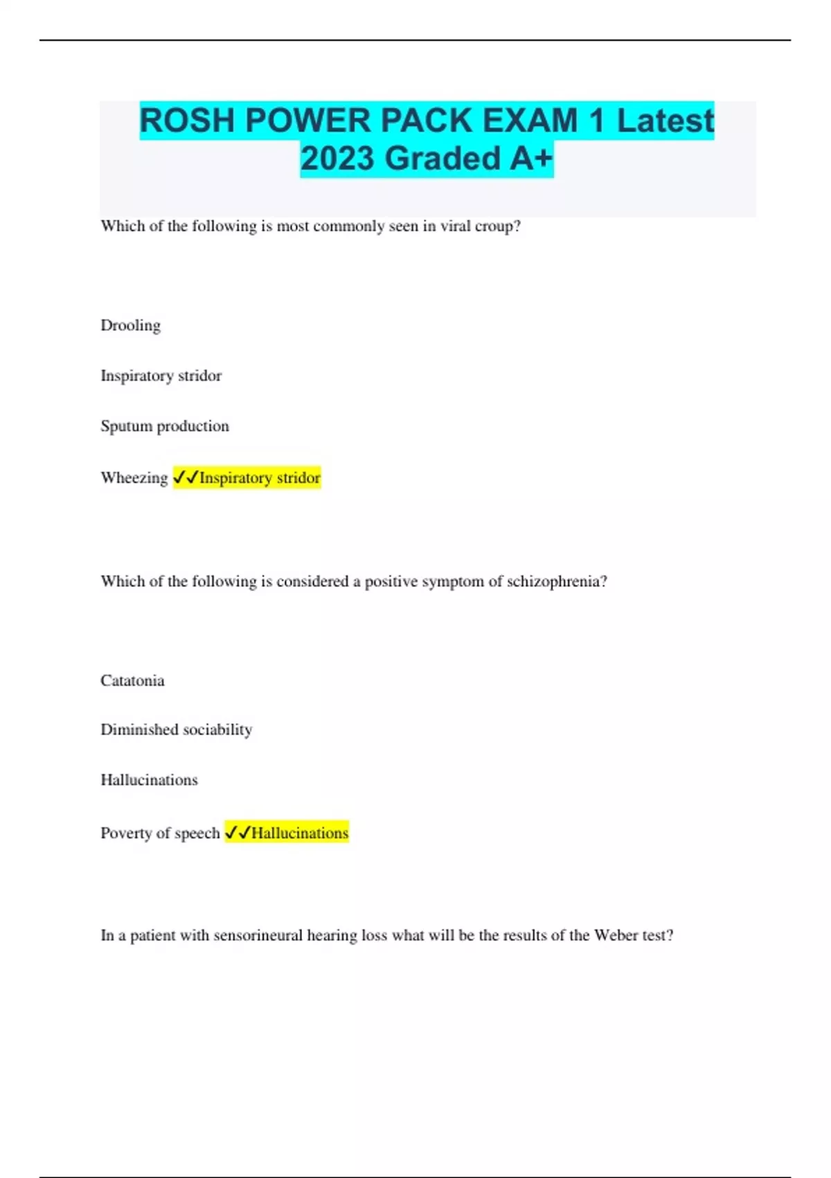 ROSH POWER PACK EXAM 1 Latest 2023 Graded A+ Which of the following is most commonly seen in viral croup? Drooling Inspiratory stridor Sputum production Wheezing Inspiratory stridor Which of the following is considered a positive symptom of schizophrenia? Catatonia Diminished sociability Hallucinations Poverty of speech Hallucinations In a patient with sensorineural hearing loss what will be the results of the Weber test? Patient will report the sound louder in the affected ear The patient will hear the sound equal in both ears The patient will hear the sound louder in the unaffected ear The patient will hear the sound louder in the unaffected ear What disease does Rickettsia rickettsii cause? Epstein-Barr virus HSV Lyme disease Rocky Mountain Spotted Fever Rocky Mountain Spotted Fever White oral lesions which can be scraped off leaving punctate bleeding should make you think of what diagnosis? Aphthous ulcers Oral candida Oral herpes simplex Oral Leukoplakia Oral candida Long term use of which of the following drugs may cause a drug-induced lupus-type eruption? Ceftriaxone Oral contraceptives Procainamide Tetracycline Procainamide Rapid Review Drug-induced lupus mnemonic: SHIPP Sulfonamides Hydralazine Isoniazid Procainamide Phenytoin A 33-year-old IV drug user presents to the emergency department with pleuritic chest pain, cough, chills, diaphoresis, anorexia, and malaise. On physical exam, her temperature is 40°C, BP 98/55, P 115 bpm, and RR 22. Two separate blood cultures are positive for S.aureus. Which heart valve is most commonly affected in a patient with this history and presentation? Aortic valve Left ventricle Mitral valve Tricuspid valve Tricuspid valve A positive Auspitz's sign should make you think of what diagnosis? Atopic dermatitis Basal cell carcinoma Molluscum contagiosum Psoriasis Psoriasis Pertussis is