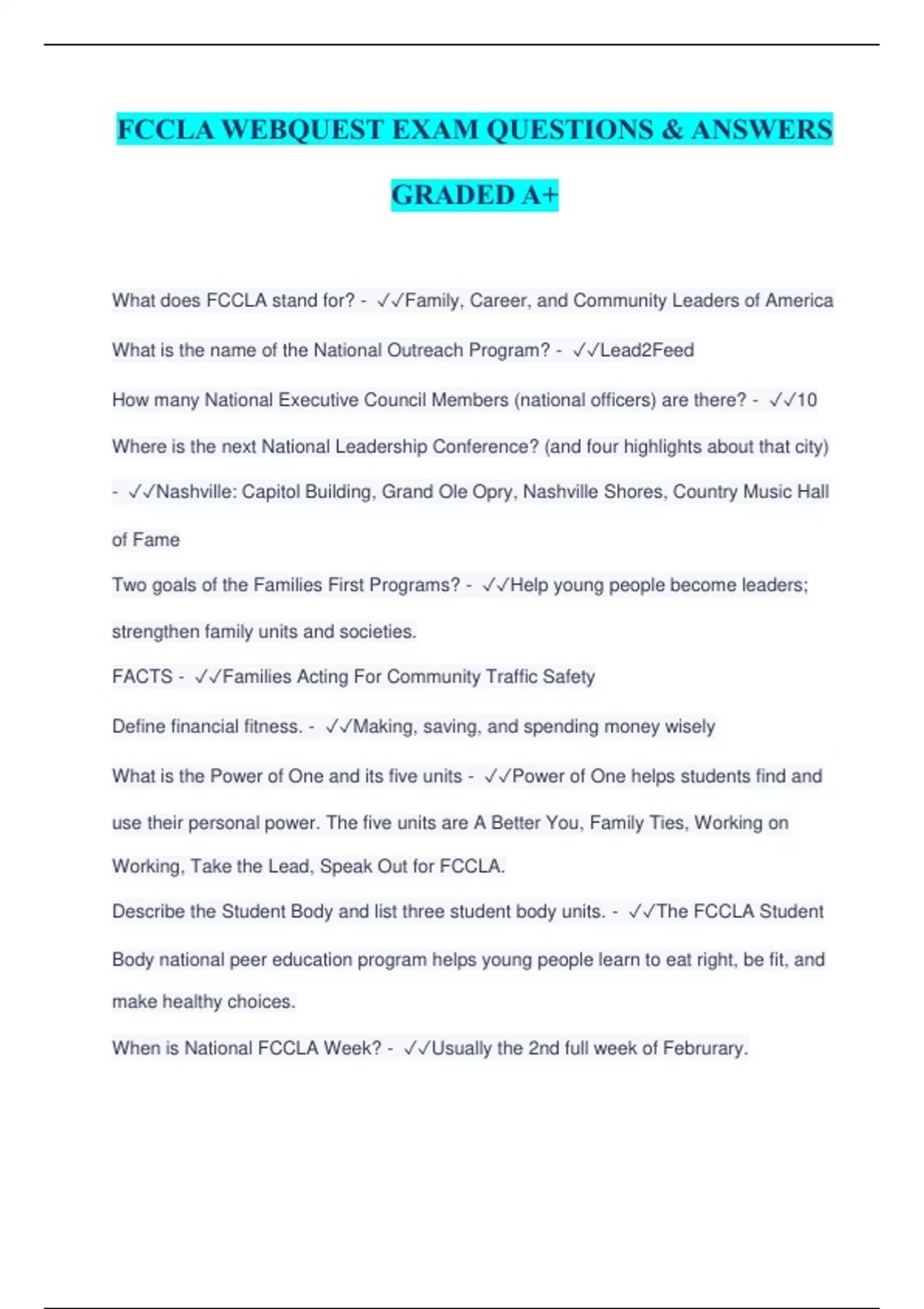 FCCLA WEBQUEST EXAM QUESTIONS & ANSWERS GRADED A+ What does FCCLA stand for? - Family, Career, and Community Leaders of America What is the name of the National Outreach Program? - Lead2Feed How many National Executive Council Members (national officers) are there? - 10 Where is the next National Leadership Conference? (and four highlights about that city) - Nashville: Capitol Building, Grand Ole Opry, Nashville Shores, Country Music Hall of Fame Two goals of the Families First Programs? - Help young people become leaders; strengthen family units and societies. FACTS - Families Acting For Community Traffic Safety Define financial fitness. - Making, saving, and spending money wisely What is the Power of One and its five units - Power of One helps students find and use their personal power. The five units are A Better You, Family Ties, Working on Working, Take the Lead, Speak Out for FCCLA.
